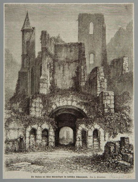 Curator: This is “Perspective of the rear,” an etching by Giovanni Battista Piranesi. He's best known for his dramatic, large-scale depictions of Roman ruins. Editor: It's overwhelming. The sheer density of detail and the contrast between light and shadow create a really disorienting yet captivating space. There's so much going on visually. Curator: Precisely! Piranesi's etchings were not merely documentation, they are potent symbolic commentaries on the grandeur and decay of empires. Notice the scale—these towering, crumbling structures dwarf the human figures, suggesting the transience of human achievement. Editor: Yes, that dramatic scale shift. The eye is immediately drawn upward along these stark vertical lines, almost forcing a sense of insignificance. The textures, built from incredibly fine lines, create a powerful illusion of depth and decay. It’s a masterclass in black and white composition. Curator: The ruin, in this case, that of the Castello dell'Acqua Giulia, isn't simply a pile of stones. For Piranesi, the remnants are symbols of a lost golden age, a stark reminder of mortality and the cyclical nature of history. It touches upon this melancholic feeling where only memory remains as a connection to the past. Editor: The dense layering and chaotic detail certainly amplify this feeling of history collapsing in on itself. It's not a neat or idealized view of the past, it feels very tactile and gritty, a stark visual representation of entropy itself. You can see how influential this style became on romantic and even surrealist artists. Curator: And that’s the key to Piranesi. His work transcended mere representation; he transformed architectural documentation into powerful metaphors. Editor: Exactly, by isolating and abstracting these architectural forms, Piranesi compels us to confront the complexities of time, ruin, and the very act of seeing. Curator: He's asking us to meditate on the stories embedded within these decaying stones. Editor: I leave feeling profoundly moved, grappling with layers of visual data and the echoing resonance of time.