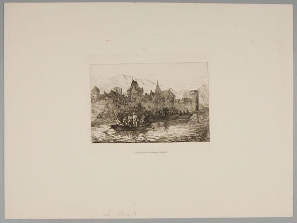Curator: This is Alfred Louis Brunet-Debaines' "View of the S. Louis Bridge." The etching, held in the Harvard Art Museums, presents a moment of 19th-century Parisian life. Editor: It has such a quiet, melancholic feel, doesn't it? The bridge stretches across the Seine, and those little boats seem almost frozen in time. Curator: Brunet-Debaines was known for his precise technique and meticulous attention to detail. Look at how he captures the textures of the buildings and the reflections in the water through the etching process. The socio-economic implications of riverside labor also add to the piece’s profundity. Editor: Absolutely, and the subtle gradations create a lovely atmospheric perspective. It feels like a memory, fading gently at the edges. Curator: The etching technique allowed for the mass production of images, making art more accessible, yet also changing its status as a commodity. Editor: I see the city breathing, you know? I get lost in that bridge, imagine wandering through those streets. It reminds me that even in the busiest cities, there are quiet corners. Curator: Indeed, it’s a moment captured in time. Editor: I love how the print speaks volumes, despite its simplicity.