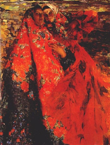 Filipp Malyavin made this large painting of himself with his wife and daughter with oil on canvas. The first thing I notice is the sheer energy in the mark making, the thick, impasto paint, and how the figures seem to emerge from the swirling brushstrokes like a dream. It’s like Malyavin wasn’t just painting a portrait, he was wrestling with the very act of seeing and recording. Look at how the figures' dresses dissolve into abstract daubs of colour. The textures are so rich, you can almost feel the weight of the paint. It reminds me a little of Klimt, but with a rawer, more visceral edge. The way the figures are almost swallowed up by the background, it speaks to the push and pull between the individual and the world around them. Are they dominating or are they being dominated? I can’t help but feel that Malyavin is suggesting that art isn’t about capturing reality, but about creating it, one brushstroke at a time.