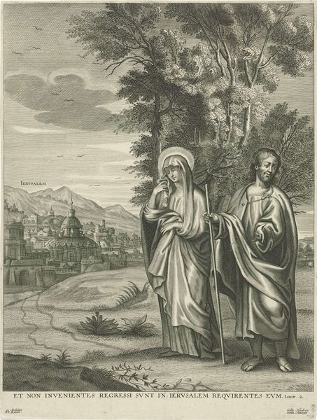 Curator: This is Jacques Callot's "Saints Peter and Paul" etching. I'm struck by the contrast between the figures, a study in light and shadow using only line. Editor: The cross-hatching creates texture, but also emphasizes the labor-intensive process of printmaking itself. The social context of religious imagery at the time is also quite telling. Curator: Precisely. The linear quality seems almost exaggerated, yet there's a formal rigor in how Callot uses hatching to define the figures within the arch. Editor: And how this image circulates – how many hands touched the plate, the paper, and the final print itself. The means of production are as important as the subjects. Curator: The composition directs our eyes upward, emphasizing the sanctity and symbolic weight of the keys and sword. Editor: Right, and reflecting on who had access to these prints also helps us understand the work's social impact. Curator: Ultimately, the enduring power lies in Callot's mastery of the medium, a perfect blend of form and skill. Editor: Yes, the print's circulation underscores how images can shape and reinforce cultural beliefs.