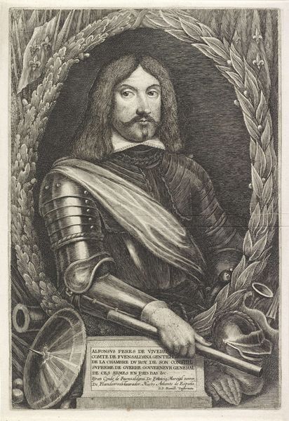 Pieter de Jode II created this engraving, "Portret van Francisco de Melo, graaf van Assumar," capturing the likeness of a prominent nobleman. The portrait provides a window into the rigid social hierarchies of 17th-century Europe. Francisco de Melo's attire and bearing speak volumes about his status, from the elaborate armor signifying military prowess, to the baton that represents his authority. Yet, such displays of power were often carefully constructed, reflecting both the individual's identity and the expectations of their class. This image suggests the weight of responsibility and the performance of identity required of those in positions of power. Portraits like these remind us that identity is not merely personal but is also deeply shaped by historical and social forces. What do you see in de Melo's eyes?