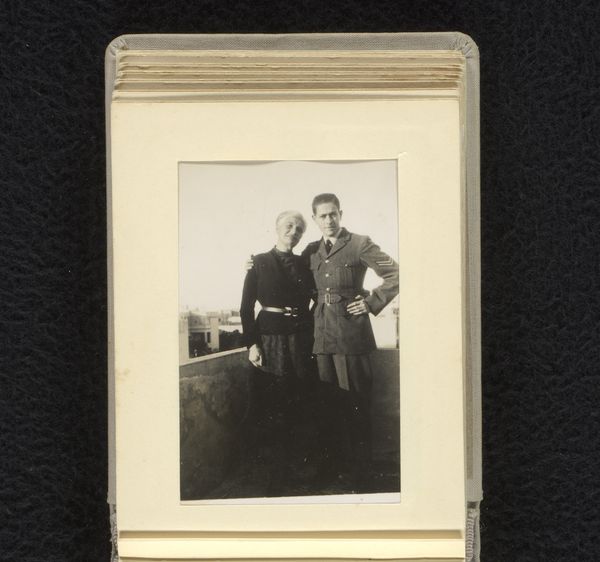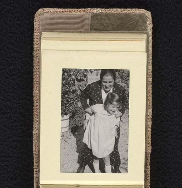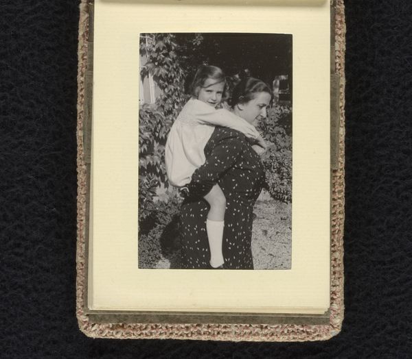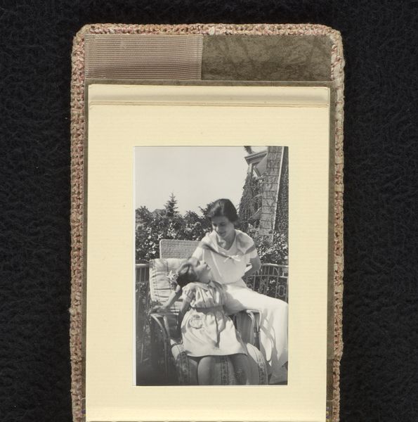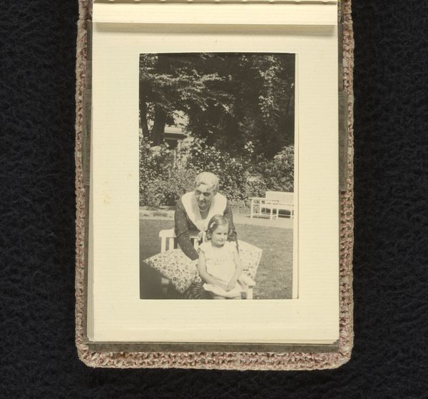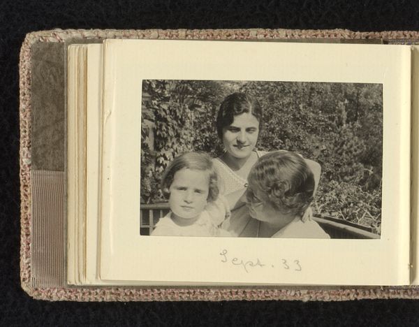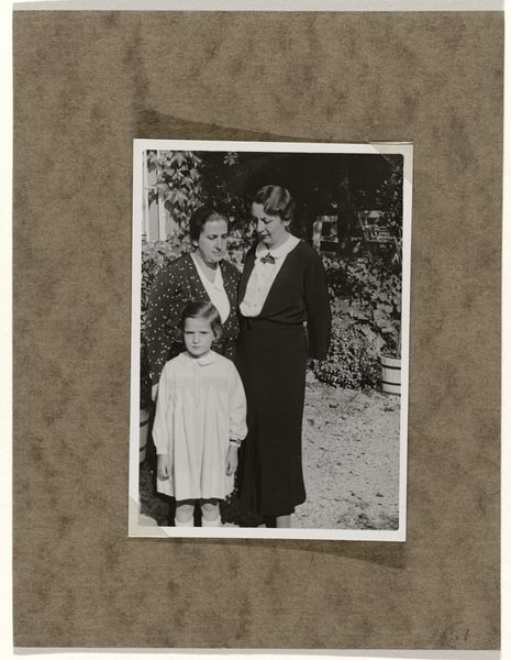 Curator: This is a photograph titled "Isabel Wachenheimer op de bank met haar oom Willy Moos, en haar moeder Else Wachenheimer-Moos en een onbekende vrouw op de achtergrond, juli-augustus 1933, Hamburg." It is a gelatin-silver print dating probably from 1933 to 1937. Editor: There's a formality to this portrait. The subjects appear carefully arranged, but there’s also a poignant sense of restrained emotion, a kind of stilling of time. Curator: Considering the date, that restraint takes on a historical weight. The family's position as Jews in Hamburg at that time is inescapable. The photograph functions not just as a family memento but as documentation of a life about to be fundamentally changed, perhaps even erased. The use of the gelatin-silver process allowed for a sharp clarity, creating an artifact with an immediate visual presence even decades later. Editor: Visually, I'm drawn to the composition, particularly the stark contrast between light and shadow. This intensifies the subjects' expressions. The layering of figures creates a depth despite the limited tonal range. It uses light and shadow for emphasis—notice the little girl looking away from the viewer. Curator: Exactly, the social context elevates this simple image. The photo, presumably taken in a garden, hints at a certain bourgeois normalcy, now rendered bittersweet by what was to come. It invites contemplation on issues of identity, family, and historical memory. The labor invested in this careful construction contrasts sharply with the disintegration the family would soon experience. Editor: Perhaps. But as a photographic object, the controlled aesthetic qualities speak to an attempt to capture more than just a moment. Consider the angles and the specific way light plays on each subject. Curator: It becomes difficult, though, to divorce the aesthetic choice from the lived reality; it’s like the medium itself bears witness to history. This photograph highlights how materials carry historical weight beyond their inherent properties. It’s a document shaped by power and circumstance. Editor: Well, for me it captures the fragility of familial bonds but formal elements carry significant weight beyond their documentary qualities. It encourages us to appreciate photography, particularly portraiture, as more than mere records, rather seeing them as works of art in and of themselves. Curator: Perhaps the dialogue we have here opens up this historical picture to future interpretations and understandings that provide it further lasting power. Editor: Absolutely, as long as viewers keep an open eye to every part that makes this composition what it is.