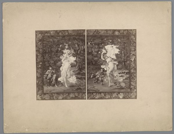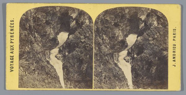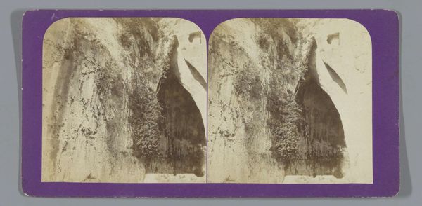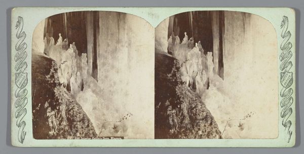 Curator: This captivating stereo card presents "American Falls Seen Through an Ice Arch on Luna Island." Attributed to George E. Curtis, the gelatin-silver print was likely produced between 1866 and 1910. Editor: My immediate impression is that of stark beauty; the contrast between the delicate ice formations and the powerful waterfall is striking. It has an ethereal, almost ghostly quality due to the monochrome palette. Curator: Precisely. The material process is fascinating: Creating a stereo image involved specialized equipment and precise chemical processes to evoke depth. These cards were mass-produced for popular consumption, offering armchair travel experiences in an era of limited mobility, but still it is clearly made to look hand crafted like a watercolor.. Editor: Yes, there's that undeniable tension between the mechanical reproducibility and the romantic vision it presents. Formally, consider the composition; the icy arch frames the falls, drawing the eye into the receding space. The texture of the ice contrasts dramatically with the smooth water. Curator: Right, and let’s think about the workers producing these en masse. They become complicit in not just churning out identical products but propagating an ideological construct where ‘nature’ can be bought and owned by the consumer, commodified even to allow for personal wonder! Editor: But can’t you appreciate that from an aesthetic point, without denying those historical labor conditions that enabled that romantic sentiment in art to persist and spread during the time period through semiotics of popular objects? There's undeniable artistry at play here in balancing depth, contrast, and tone in what appears a flat 2D field. Curator: I suppose; however the societal circumstances cannot just be a side note or something completely dismissed; after all who exactly this kind of images catered towards indicates a very important conversation surrounding consumerism. The act of distribution itself must also become a main interest, more than some individual "artistry," whatever that may mean. Editor: I concede the card serves as both a beautiful composition, regardless of intention but, more importantly as an artifact representing evolving class dynamics surrounding art. Thanks for sharing insights!