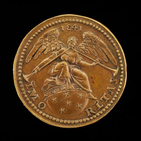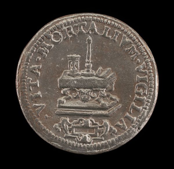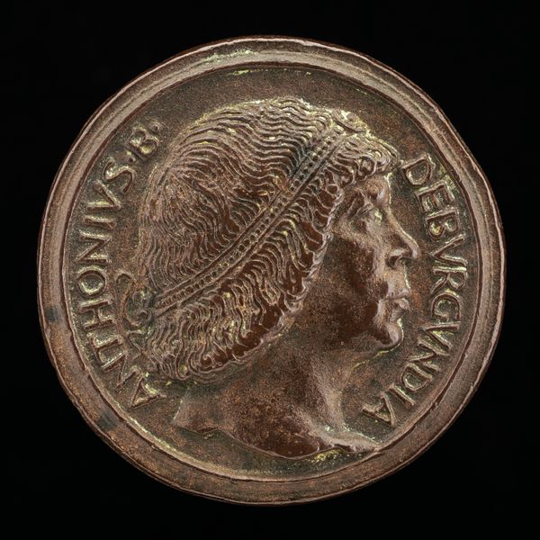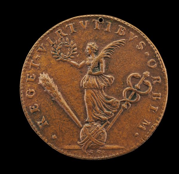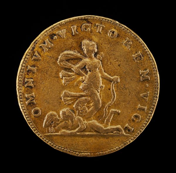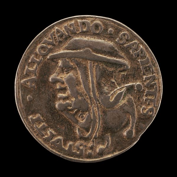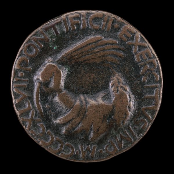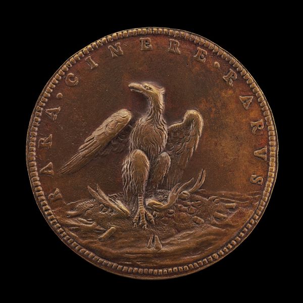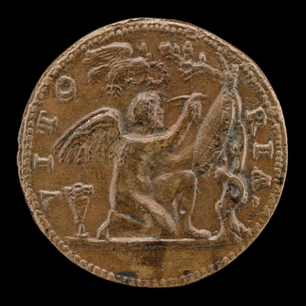 Curator: This striking bronze medal, "Phoenix on a Burning Pyre" was created around 1500 by Giancristoforo Romano. What are your first thoughts looking at this object? Editor: I'm immediately struck by its weight, not literally, but symbolically. The phoenix rising is such a potent image, it speaks of hope and rebirth amidst destruction. It makes me consider the symbolic role of this subject over time. Curator: Absolutely. And thinking about the physicality of it, the bronze itself would have been cast, perhaps using the lost wax method. This was an involved process with specialist workshops and expertise, where the artistry wasn't just in the design but also the making. The mold and the burning, almost echoing the subject in its making, right? Editor: Precisely! And let's dive deeper into that imagery. The phoenix, immolating itself and being reborn from the ashes…It's a powerful symbol of resilience, but also speaks to the cycles of time, the promise of renewal after hardship. How would this phoenix motif be circulated, beyond its function as a commemoration or even currency? Curator: As a small, easily transported object it would move ideas and values. Also consider its original owner and the aspirations linked to them as a patron. The artistic labor in creating this wasn't simply aesthetic but inherently tied to communicating and reaffirming power. The Latin inscription is a kind of marketing blurb of values. Editor: Good point! Latin inscription, right -- it amplifies that intended, desired narrative. And, looking closer, even the stylized flames beneath the bird become a visual metaphor. It creates a sort of language beyond words. Curator: So it’s more than just visual rhetoric; it’s deeply embedded in material practices, craftsmanship, and distribution methods of the early Renaissance. It reminds me to reflect upon the way social standing was affirmed through craft. Editor: For me, this image brings forward how archetypes function. Seeing this spurs connections between cultural past and personal longings for hope. That image, paired with the solid reality of the medal, becomes an incredible anchor across time. Curator: I’m reminded that every surviving material artifact, from coin to high art, holds embedded echoes of a very physical production—skilled workshops and trade networks. Editor: Agreed; in turn, seeing that artistry connects to our deepest psychological roots with themes of regeneration that still move us.