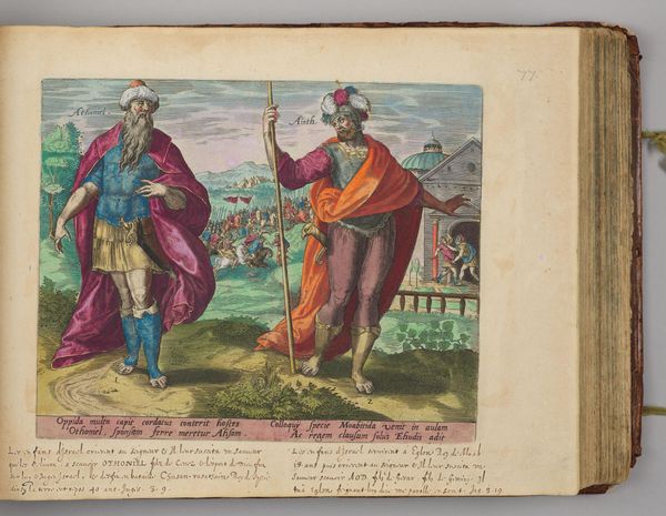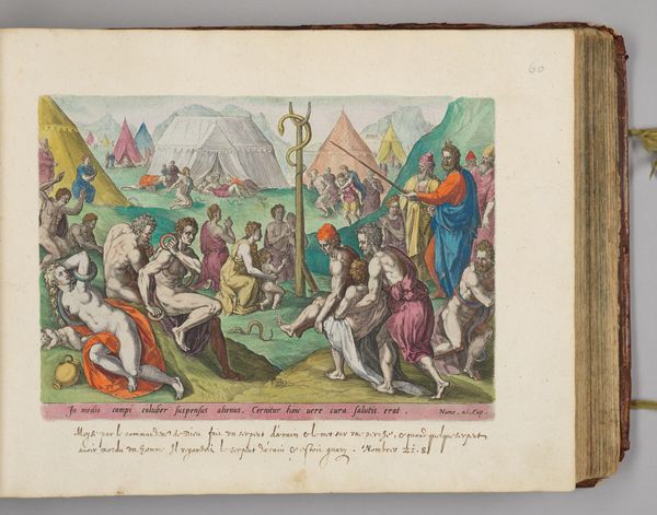 Editor: Here we have Hans Collaert the Elder's "David Sparing Saul's Life". The scene has a dreamlike quality. The colors are surprisingly vibrant, yet there's an almost comical stillness. What do you make of this strange tableau? Curator: Well, it's like stepping into a stage play, isn't it? Collaert beautifully captures the tension, David’s quiet courage juxtaposed with the vulnerability of Saul, surrounded by his slumbering guards. It makes you wonder, doesn’t it, about the weight of leadership and the burden of paranoia. Editor: It does. And the somewhat odd coloring? Curator: Adds to that theatrical feel, wouldn't you say? Transports us to a world where the stakes are high, but everything is heightened, almost fantastical. I feel like I've glimpsed a secret performance. Editor: I see what you mean. It's like peeking behind the curtain of history.