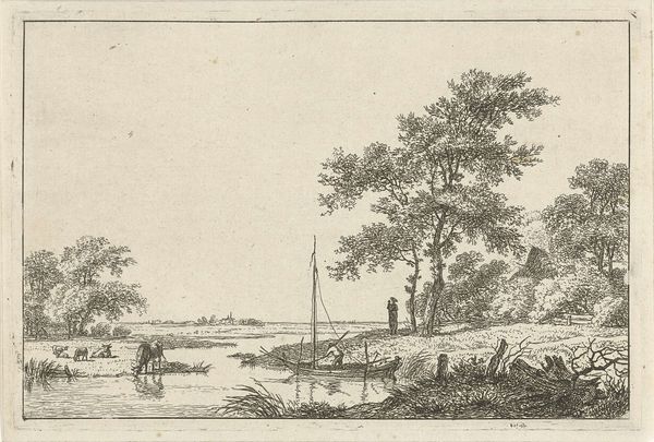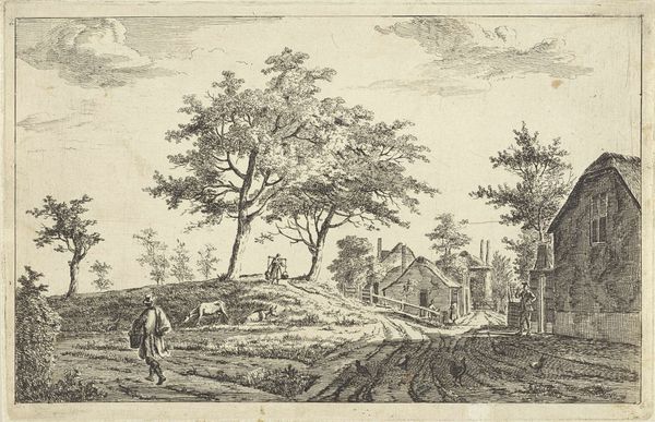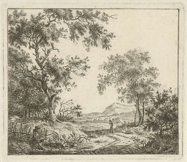 This print, "Landschap met waterput" or "Landscape with Water Well" by Hermanus Fock, was made with etching, a printmaking technique that democratized image production in the 18th and 19th centuries. The scene is created by drawing with a sharp needle on a wax-coated metal plate, which is then bathed in acid. This process eats away the exposed lines, which are then inked and printed, leaving a raised impression on paper. The lines evoke the textures of foliage, earth, and the wooden structure of the well. The labor-intensive process mirrors the manual work depicted in the landscape, suggesting the rhythms of rural life. Fock’s etching embodies a shift towards accessible art, reflecting a wider movement of images and knowledge. The print exists as an artifact that emphasizes the importance of material, making, and context in understanding art, and challenges the idea of fine art as separate from craft.