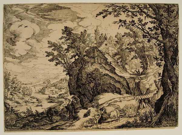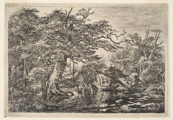 Curator: This is Jacob van Ruisdael’s etching, “A Forest Marsh with Travelers on a Bank,” also known as "The Travelers," dating from somewhere between 1628 and 1682. Editor: It's incredibly dense, almost claustrophobic, wouldn't you say? All that detailed foliage pressing in on the tiny figures… it feels almost suffocating. Curator: Yes, the composition is meticulously structured, isn't it? The eye is led through the tonal gradations, from the dark, textured foreground to the lighter, atmospheric distance. Editor: Speaking of texture, look at the way he renders the bark on that massive, gnarled tree—it's remarkable what he achieves through etching alone! It gives weight and history to the work, makes you think about the years it took to get to that form. What ink, what tools, what processes did it require to produce that? Curator: Absolutely. Van Ruisdael exploits the linear quality of etching to great effect. Notice the intricate network of lines creating a sense of depth and conveying the textures of wood, water, and foliage? It serves to emphasize a certain... contemplation. Editor: Exactly, and how does the etching process itself speak to the accessibility of art for a burgeoning middle class at the time? Etchings facilitated reproduction, mass consumption, all enabled by advancements in material production, wouldn't you say? Curator: That's a valuable point. Considering how his contemporaries utilized these methods...The landscape takes on symbolic weight, as does the medium. I'm seeing Dutch Golden Age classicism here—light and shade and symbolism… Editor: Yes! And how did changes in forestry, lumber industries, and water management shape the very landscapes that artists like Van Ruisdael chose to portray? This isn't just pretty trees, this is an industrialized vision! Curator: Fascinating perspectives indeed! It certainly stimulates ideas about labor practices as it relates to landscape and the human condition at this point in Dutch Golden Age printmaking. Editor: Right, giving me food for thought on the cultural material of 17th-century Holland, wouldn’t you agree?
