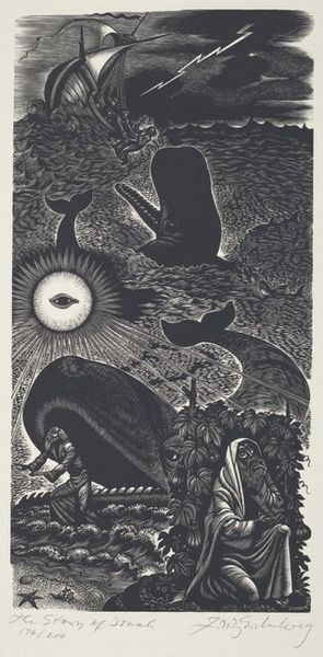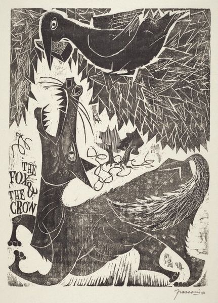 Curator: Welcome. We are looking at a woodcut on paper, tentatively titled "Two Horses in a Hilly Landscape, Ireland," created by John B. Flannagan around 1930. Editor: My first thought? It's incredibly cozy! The heavy lines, the way those horses huddle together, the little cottage tucked in the background… I want to be *there*, preferably with a warm blanket and a book. Curator: The romantic depiction of rural life echoes a larger cultural phenomenon in the early 20th century, with artists like Flannagan seeking authenticity and spiritual solace in simpler, agrarian settings, away from rapid industrialization. Editor: It’s interesting you mention the “romantic depiction,” because the stark contrast of the black ink gives the scene a slightly ominous, dramatic feeling as well. Like a storm's coming in. Curator: Absolutely. That tension is deliberate. Flannagan was deeply engaged with European modernism, particularly the German Expressionists, who utilized woodcuts for their powerful, emotionally charged imagery and social critique. This artwork speaks to a longing for something beyond modern society, but the sharp lines hint at a troubled world, especially considering this piece was created as global conflicts grew. Editor: See, I read that darkness as comforting! It’s honest, a raw, almost primal feeling. These horses aren’t just pets; they are connected to the land in a fundamental way. I like that there's also a sort of intimacy; it really captures the horses and their presence in that quiet moment of affection. Curator: Flannagan often drew on personal experiences, having traveled extensively. In that light, it's possible this woodcut embodies not only cultural observations of Irish society, but reflects a connection to simpler, rural ways of living. Editor: It's all in the texture. The way he uses those carved lines to suggest form, movement, mood, especially the rugged Irish hills—it elevates what could be a mundane scene. It's not just a pretty picture of Ireland; it’s alive with feeling. Curator: Yes, Flannagan sought to represent profound human, and indeed animal experiences in his work, even using his preferred method of direct carving to give a greater sense of authenticity to his craft. Editor: For me, it's a reminder that art isn’t always about shiny, perfect things. It's about finding beauty, and perhaps a bit of comfort, even in the harsh realities of the world. Curator: And for me, an opportunity to think about art's function to explore these emotions in response to large social shifts. Thank you for your thoughts.