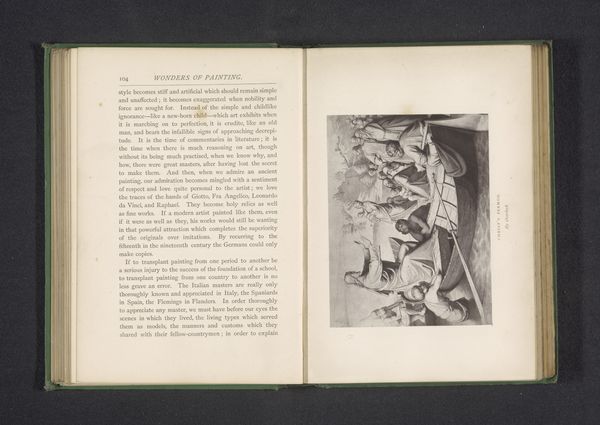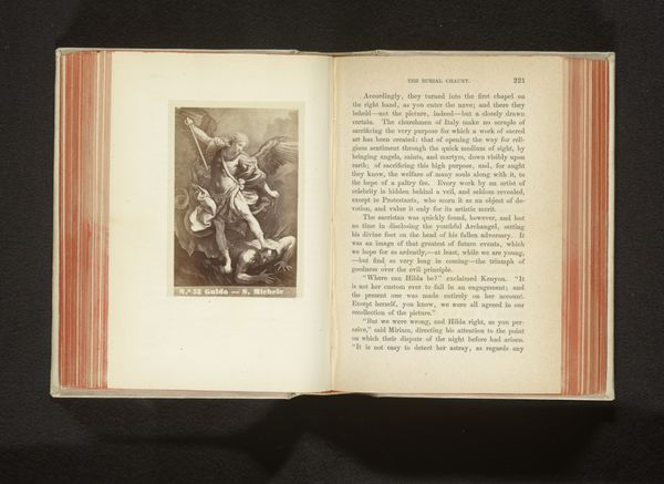 This is a photographic reproduction in a book of Guido Reni's famous painting of the Archangel Michael. Looking at the image in its cultural context, this reproduction is found in a novel. It is clear that the author expected the reader to be familiar with Reni's work, to be able to visualize it from this small, monochrome image. It speaks to the cultural capital that such artworks had at this time, and the role of religious imagery in shaping the moral and aesthetic values of society. What does it mean to encounter a masterpiece in this form? The presence of this photograph in a novel shows how art could permeate different aspects of Victorian life, influencing literature, morality, and even personal identity. As historians, we can delve into the cultural significance of such artworks by studying not only the original paintings but also their reproductions and references in literature, exploring how they shaped the imagination and values of different eras.