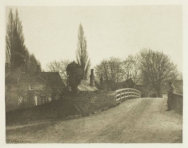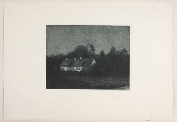 Curator: This evocative artwork, titled "A Village Corner," created sometime in the late 19th or early 20th century, comes to us from the hand of Theodor Hofmeister. He employed charcoal to render this landscape scene. What strikes you first? Editor: That huge, brooding tree almost eclipses the house entirely. It feels… weighted, like a storm's just passed or is about to break. The stark contrast heightens the sense of foreboding, doesn't it? Curator: Absolutely. The dominance of nature is a common Romantic theme. Look at the deliberate composition, how the artist positions the massive tree as a protector, or perhaps even a guardian, over the humble village dwelling. Editor: I wonder if it’s protective, though? The size makes me feel like its overbearing and even oppressive, casting the village in shadow. The home almost feels like a symbol of fragility set against the immense and timeless natural world. It feels, dare I say, gothic? Curator: I see that. There's certainly a psychological tension. Hofmeister seems less concerned with pictorial accuracy and more interested in mood. It reflects humanity’s relatively vulnerable place in the grand scheme. Notice, the trees dwarf the architectural feat of the little house. Editor: Right! Charcoal lends itself so well to expressing this mood, these layers of grays—the ethereal sky, the imposing trees—give a real sense of depth and mystery. All the windows of the building looking back, are dark empty squares… almost sinister, aren’t they? Curator: Precisely. The monochromatic palette also enhances the drama, stripping away any distractions of color. In that regard, consider how Hofmeister may be exploring deeper cultural memory through the contrasting symbolism. Light, representing enlightenment, battling with shadow, perhaps embodying ignorance or the unknown. Editor: And there we are… I am drawn into what the symbols mean, of home, security, and yet how everything around can also hold opposing darker implications. Curator: Indeed. It remains a wonderfully atmospheric piece and thought-provoking exploration of themes universal to our experience. Editor: Definitely. I’m looking into nature a bit differently now... slightly more anxiously!