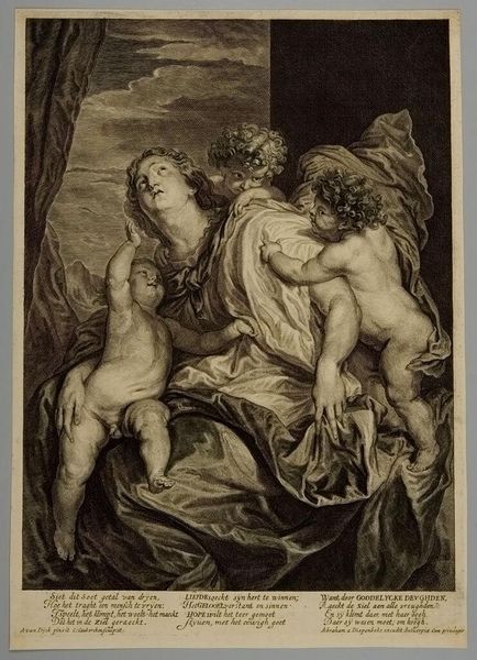 Editor: Here we have Gérard Audran's "Aeneas Saves His Father from the Burning of Troy." The figures are rendered with such detail. What strikes you first about its composition? Curator: It's the pyramidal arrangement, isn't it? Note how the figures are carefully positioned to create a stable, almost classical structure. The interplay of light and shadow, achieved through the etching, further defines this structure, emphasizing the musculature and conveying a sense of dramatic tension. Do you observe how the gaze directs our own? Editor: Yes, Aeneas looking up, the child looking off to the right, it creates a sense of urgency and movement. Is that intentional? Curator: Precisely! The artist utilizes these devices to enhance the narrative. The strong diagonals created by the bodies imply motion and escape. Also note the textures, from the drapery to the skin – how do they contribute to your understanding? Editor: They add depth and realism. I hadn't considered how much the varied textures amplified the drama. Curator: Indeed. The formal elements reinforce the emotional weight of the scene. These choices by Audran are key to the work’s enduring impact.