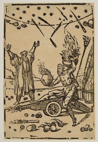 Editor: This is "Vulcan Leads the Metals to the Refinery" by Domenico Beccafumi. It's an intriguing image, almost like a stage play unfolding. What strikes you about its visual language? Curator: It's a fascinating print, reflecting the Renaissance fascination with classical mythology and its integration into social and political ideologies. Consider how Vulcan, the blacksmith god, embodies labor and craftsmanship, virtues that were being increasingly valued in the rising merchant class of the time. Editor: So, it's less about the literal myth and more about the values it represents in society? Curator: Precisely. Beccafumi uses this mythological scene to subtly comment on the burgeoning importance of industry and trade within the social fabric. The presence of Mercury suggests the role of commerce in this transformation. What do you make of the choice of printmaking as the medium? Editor: That's a good point. Prints would have been much more accessible. It's democratizing the message. Curator: Exactly. It becomes a vehicle for disseminating these values to a wider audience. It is really interesting how this piece demonstrates that art is for the people and about the people.