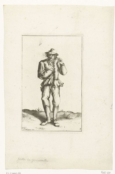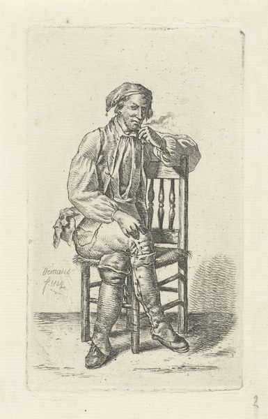 Curator: This is a piece entitled "Zittende man met stok," or "Sitting Man with a Stick," etched by Anthonie Willem Hendrik Nolthenius de Man in 1828. It's interesting how this image has been realized. Editor: It's such a simple portrait, yet there's something quite charming about the man’s rather knowing expression. It seems almost like a caricature, in a way. What is your reading of it? Curator: From a materialist perspective, it’s fascinating to consider this etching not just as a portrait but as a product of its time. Think about the process involved. Anthonie Willem Hendrik Nolthenius de Man, created the drawing, which required materials like the etching plate, acids, and specialized tools. Then he transferred it to the etching, from which all copies originate. The material components define the form and content of the image. How do you see the choice of etching influencing the piece's overall effect? Editor: I see that! The etching process lends itself to fine detail, evident in the texture of his clothing and the shading of his face. This creates a tangible feeling – you can almost imagine running your fingers over the etched lines. Curator: Precisely. And this tactile quality connects us to the labor involved in its creation, something often overlooked. Think about the intended audience – who would have consumed prints like these and in what contexts? Also, the production means a deconstruction of the concept of singularity regarding the image. Editor: Knowing how it was produced and for whom does offer a fresh outlook! I am wondering now who printed it and under which conditions. Curator: Indeed. Thinking about these practical concerns opens up a wider field to inquiry beyond mere aesthetics, leading to deeper meaning-making about the artwork and its role. Editor: I agree. I will start thinking in terms of labour and materials from now on!