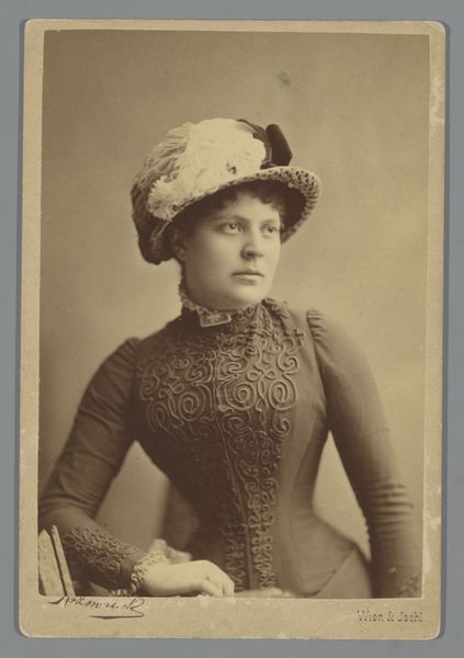 Curator: Just look at the composition of this image. This is Pierre Sayve's "Portret van een onbekende vrouw," a gelatin-silver print circa 1890 to 1895. It has such a subdued feeling to it. Editor: Yes! Something so tender, the tones have a softness that almost diffuses her very presence. Curator: The tones certainly evoke that. Sayve utilizes this subtle palette so skillfully. What do you see in terms of structural elements? The framing, perhaps? Editor: Her positioning in the shot and the details of the composition – the soft ruffles around her neck, the delicate wisps of hair around her face – create a captivating balance between grandeur and intimacy. Curator: Exactly. The way she leans gently against that faux column creates such a posed grace. Sayve really captures the poise of the era, don't you think? But there's a personal quality here, as well, almost melancholic. Editor: Absolutely. It makes me wonder who she was! What were her dreams, her fears? The way she holds her hands... almost a little closed-off. There is also the material and production method -the soft, dreamy aesthetic owes something to the impressionist sensibilities that photography seemed to mimic during this time. Curator: Very much so. The almost painterly use of light lends that quality. This isn’t just a straightforward documentation. There is artifice at work. Editor: Indeed. This isn't just about capturing a likeness; it's about crafting an image, an impression of a person, playing with allusions. Even the historical fashion gives the portrait depth. Curator: I appreciate your reading into the depth. Sayve definitely crafted a small mystery with the inclusion, or lack thereof, of contextualization. Editor: Agreed. Looking closer, the texture and tone of the photograph is also what makes me think about fragility and quiet resilience. This woman, immortalized. Curator: You put into words perfectly how this piece moves beyond its materiality into emotional resonance. A poignant portrait that offers quiet intrigue.