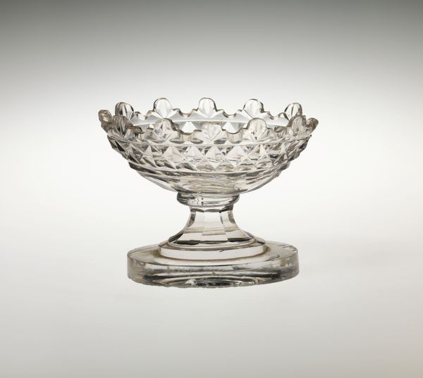 Editor: This saltcellar, crafted by the Mount Washington Glass Company between 1890 and 1893, is a fascinating little sculpture made of glass, and it looks so delicate. With its geometric cuts, it looks very precious, a simple container turned into something quite beautiful. How would you interpret its significance? Curator: The first thing that strikes me is its materiality. Glass production in the late 19th century involved complex labor practices. We must consider the skilled glassblowers, cutters, and polishers who shaped this object. This object wasn’t merely decorative; it participated in a burgeoning culture of consumption. Salt, once a precious commodity, became increasingly accessible due to industrial production and distribution networks. What does it tell us about society's changing relationship to value? Editor: That's a great point! Thinking about the laborers really makes me look at it in a new light, recognizing the skill involved in making all of those precisely cut facets. So, you're saying its value is tied not only to the material, but also to the labor, industrialization, and broader shifts in society at the time? Curator: Precisely! We can analyze its form as a product of specific tools, techniques, and economies. Consider how technological advancements made intricate glass cutting more efficient. These saltcellars entered middle-class homes, signaling a desire for affordable luxury. By examining these aspects, we uncover a complex network of production and consumption shaping everyday objects like this one. It challenges the typical definition of ‘art’, by focusing on material reality. Editor: I see it differently now. What I previously saw as just "decorative art," I now see as a convergence of industry, labor, and societal values, all reflected in this small, glass object. Curator: Exactly. It's about unraveling the relationships embedded within the object itself. We’re excavating those often invisible structures of production and consumption.