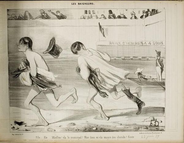 Curator: Well, here we have "How about this? The officer takes a dip..." by Honoré Daumier. Editor: Oh, what a splash! The chaotic energy practically leaps off the page. Curator: Daumier, born in 1808, had a knack for capturing these kinds of… moments. The composition, the way the figures are arranged… it’s all so dynamic. Editor: The humor's biting, isn't it? A face-first plunge for authority, while everyone else just watches. Reminds me of power structures undermined by sheer absurdity. Curator: Indeed, the Harvard Art Museums holds this piece, allowing us to witness Daumier's social commentary firsthand. His use of line, so expressive... Editor: It's like a visual joke, but with teeth. Makes you wonder, who's really in charge here? Curator: It leaves you pondering, doesn't it?