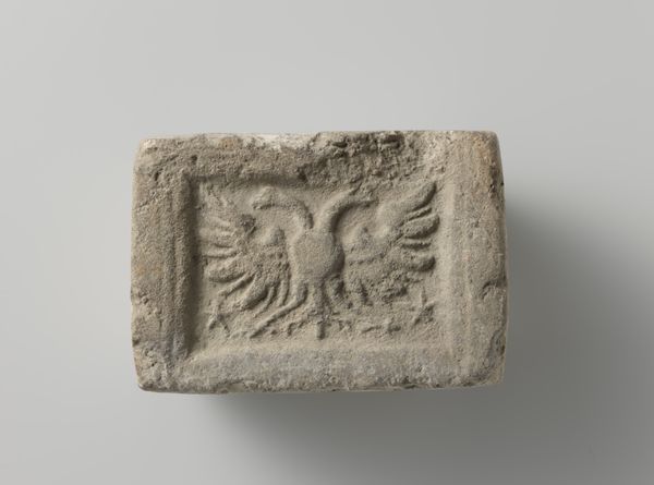 Curator: Right now we're looking at a piece titled "Haarddeksteen met het wapen van Karel V," or "Hearth Covering Stone with the coat of arms of Charles V," dating sometime between 1500 and 1558. Editor: Gosh, it's surprisingly weathered! There’s a stoic quality to it. Sort of unassuming at first glance, almost like an ancient cookie. Curator: Precisely! Its rough texture definitely evokes a sense of age and tangible history. It's made of carved wood and functions as a relief sculpture, almost modest for something that likely adorned a fireplace belonging to someone as grand as Charles V. Editor: You'd almost expect something far more ostentatious, right? But there’s something powerful in this understatement. It's essentially a geometric frame hugging a dense image field, though it requires patience to make sense of the details within it. I see an eagle and other heraldic symbols. Curator: Yes, exactly. Those symbols communicate immense power, wealth, and lineage in the visual language of the time. The choice to render it in a seemingly simple, even crude way adds another layer. It hints at both the emperor's earthly dominion and the relentless march of time. There is also the matter of what its purpose, a common “Haarddeksteen” usually served an aesthetical propose over its common purpose. Editor: I love how tactile it is. You can almost feel the maker's hand shaping the wood, each groove narrating history. Curator: And the limitations! That density and those limitations enhance the sense of monumentality despite the manageable size of the block. It's as if the carver was negotiating the fine line between praising and critiquing power itself, within the constraints of the medium. Editor: Makes you think about all the stories this stone has absorbed silently. I imagine its quiet presence warmed many contemplative evenings, as Charles V gazed into the flames. Curator: It’s a potent reminder that even symbols of power ultimately succumb to erosion and perhaps... the inevitable democratization of remembrance. Editor: A poignant epilogue rendered in a humble slab, what a statement. Curator: Absolutely, and each crack whispers volumes, a beautifully understated paradox indeed!