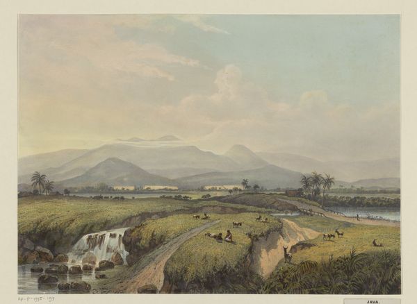 Editor: This is Johan Conrad Greive’s "Gezicht op het Tenggergebergte", a watercolor landscape from 1869 hanging in the Rijksmuseum. It's a sweeping view, almost panoramic, but there's a delicate stillness to it, a muted colour palette. It’s got these humble abodes nestled right in the heart of the composition. What’s your read of the painting? Curator: It breathes, doesn't it? I'm instantly transported... The air feels thin, tinged with volcanic dust. This piece… it's a love letter to the Javanese landscape. A deeply felt response to a world so different from Greive's own. Notice the precision of the watercolor technique. The details feel almost ethnographic. He's clearly interested in observing and recording every nuance of this alien environment. Don’t you get a feeling he may not be able to truly experience the place from the inside? Editor: That’s interesting! Alienation. I can almost sense that disconnect. The people shown are very small, and do not interact in a perceivable manner with the painter/viewer or even with the huts next to which they are depicted. Curator: Exactly. The figures become almost like landscape elements themselves. Greive places the volcano Tengger in the background like some powerful mythical symbol. How do you think this placement influences the whole work? Editor: Hmm… the smoke almost makes it seem like the mountain itself is breathing, a powerful primordial energy that dwarfs everything in the scene! Curator: Precisely. Greive invites us to not just observe, but contemplate… a quiet meditation of our place in the larger scheme of things. It’s both intimate and expansive. Editor: It definitely makes me appreciate the details of the natural world but I still think it leaves one with a slight feeling of emptiness. Thanks for walking me through the elements of this watercolour; now I see more than just a landscape! Curator: And now, so do I. Every encounter with a work of art enriches how it changes the viewer!