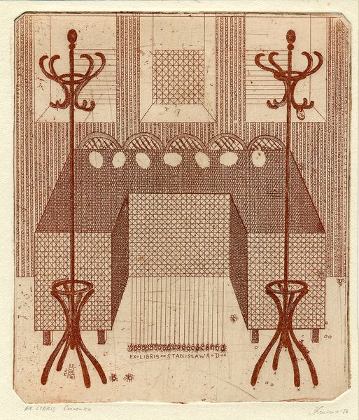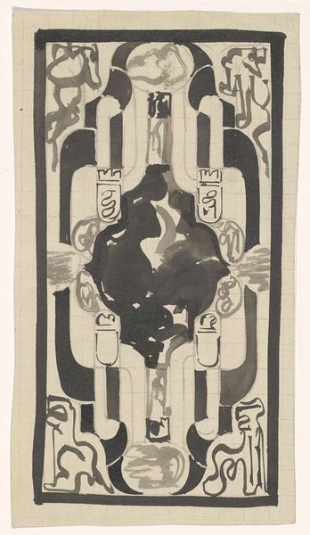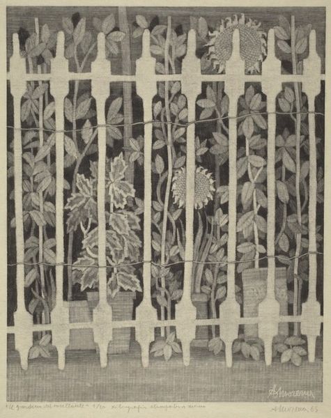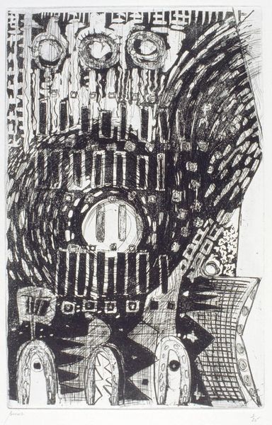 Curator: This is Nino Abranos's "Festa," created in 1955. It's a striking linocut print. Editor: Immediately, the dense patterning and monochrome palette create a feeling of controlled chaos, or maybe a codified ritual. The geometry vibrates with a kind of visual static. Curator: Yes, I see that. The geometric shapes definitely suggest ritual, but perhaps on a more fundamental level. Notice how the recurring diamond motifs seem to almost "fall" within that rough circle. It gives me the sense of established symbols being dismantled or deconstructed. Editor: Deconstructed, perhaps due to the linocut's means of production. Think about the labor involved in carving away the linoleum, methodically removing material. Each cut, each removed piece contributes to the final image, a direct interplay between intent and process. What meanings reside in labor, here? Curator: I hadn't considered the act of carving in relation to its meaning! But going back to symbols, I think that it’s interesting to observe how geometric patterns such as zigzags or checkerboards hold similar implications across drastically different cultures, such as change, paradox, or in-between states. And then these shapes are captured inside something as universally resonant as a circle. Editor: Absolutely, and this speaks to linocut's populist dimension as a cheap material for protest graphics. Could it symbolize how simple material can express revolution and profound culture change? What material shifts were Italy experiencing in 1955? What power do low means hold? Curator: A fantastic point. It transforms what I initially perceived as mere abstraction into something more pointed. I am now drawn to read that central orb as containing many fragments that suggest unity from the clash of tradition with modern life. Editor: Well, by considering linocut's inherent nature as a medium and its social context, it urges me to question traditional values assigned to what is ‘high’ art. What is commonly available holds revolutionary value for a materialist reading of the work. Curator: This exploration of "Festa" reveals just how much these stark forms contain and reflect. I leave with a fresh appreciation of both art and historical inquiry, indeed. Editor: It's intriguing how interrogating a print from its making unveils a potent social and cultural conversation. Thanks for offering a thoughtful perspective!