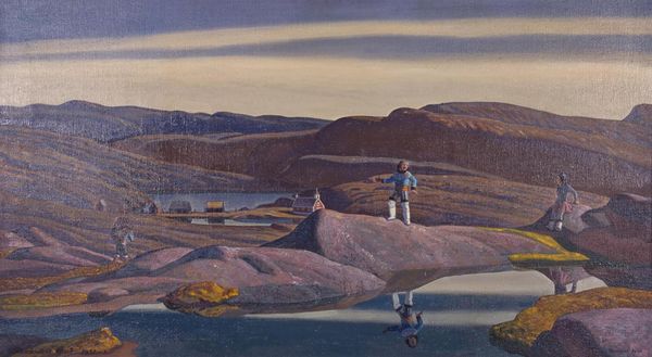 Nicholas Roerich created this painting, "Lake of Gennesaret", with oil on canvas. The composition is dominated by the tranquil expanse of water, rendered in varying shades of blue that evoke a sense of serenity. The sky, a blend of soft purples and greys, meets the horizon in a seamless transition, enhancing the dreamlike quality of the scene. Roerich's deliberate use of colour and form invites us to contemplate the symbolic underpinnings of the landscape. The boat carrying several figures alludes to journeys and transitions, while the solitary figure on the right bank offers a counterpoint, suggesting introspection. The mountains in the distance, stylized and flattened, act as a backdrop to the human drama unfolding in the foreground. The lake, as a semiotic signifier, embodies both the visible and invisible realms, reflecting the artist’s interest in spiritual and philosophical themes. In "Lake of Gennesaret", the artist uses formal elements to destabilize fixed meanings, inviting viewers to find their own interpretation.