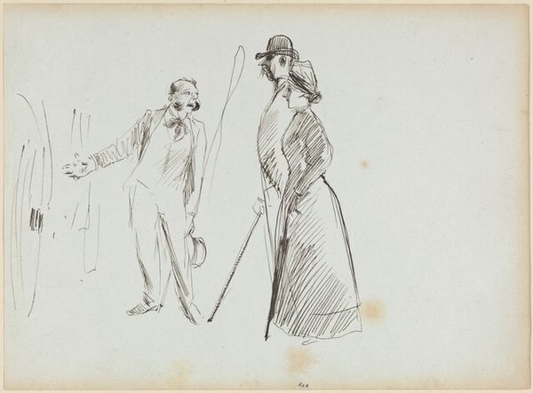 Editor: So here we have "Réjane et Galipaux, dans Madame Sans-Gêne," a drawing by Henri de Toulouse-Lautrec from 1894. It seems like a snapshot of a stage performance, quite delicate in its rendering. What do you see in this piece? Curator: Immediately, I'm drawn to the labor embedded in the quick sketch – the speed and economy of line reflecting the urgency of capturing a fleeting moment. This isn't just portraiture; it's a document of production. Lautrec is capturing actors enacting a social performance of status, using inexpensive drawing material to depict an opera meant for mass consumption. Consider the setting: Montmartre, at the cusp of immense cultural shift and class mixing in France. Editor: Interesting! It also reminds me of some theatrical caricatures; they certainly appear to be types. Curator: Precisely. It invites us to consider the socio-economic conditions enabling mass spectacle. The performers’ craft is being filtered through Lautrec's own, then circulated in prints and reproductions – democratizing art through its mechanical reproducibility. Editor: How interesting! The flatness almost denies any real space. Curator: Indeed. The materials—the cheap paper and charcoal—become central to our understanding. It asks us to think critically about the production of artistic value, challenging the traditional hierarchy separating “high art” from commercial illustration. Editor: So, Lautrec uses this "low" material, this humble process to depict this very vibrant, bustling, "low" subject, kind of making all levels equal, perhaps? Curator: Exactly! We see art not as divorced from, but rather deeply intertwined with, the economic and material realities of its time. Consider, where might one view such an image? For whom was it made and how might it be distributed and consumed? What, for you, does the medium of drawing lend this depiction? Editor: Wow, I’ll definitely consider drawings and prints as being part of a larger socio-economic network. Thanks for enlightening me! Curator: My pleasure. Always ask how the means of production affect the message, and what hands shaped the material object before you.