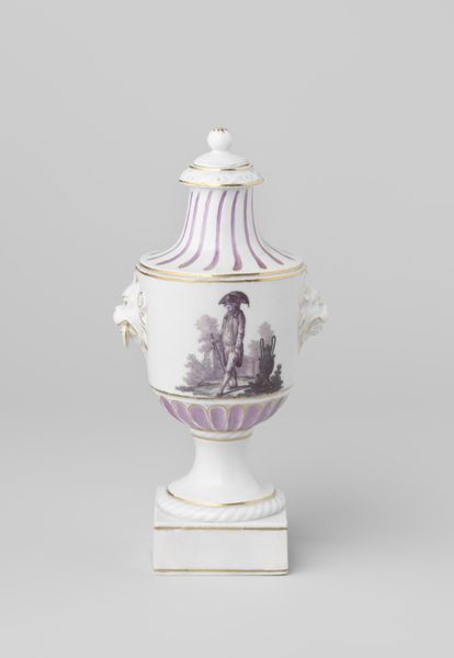 This vase was made in Loosdrecht using porcelain, a material renowned for its delicate, translucent qualities. The intricate latticework on the lid and the delicate handles of the vase demonstrate the artist's mastery of this demanding medium. Porcelain is created from a fine clay mixture fired at high temperatures. Its smooth, white surface is perfect for painting. Here, we see a hand-painted scene of ducks in a natural setting, bringing a touch of nature to this refined object. The vase is also adorned with gilded accents, adding a luxurious touch. Notice the amount of work involved in its production, from shaping and firing the porcelain to the meticulous painting and gilding. This vase is a testament to the skills and traditions passed down through generations of ceramic artists, raising questions about the nature of labor involved in the creation of luxury goods. It challenges the traditional divide between fine art and craft.