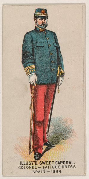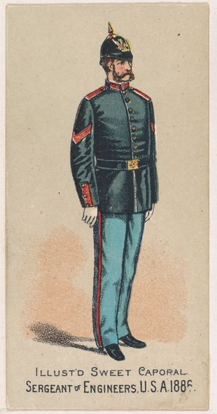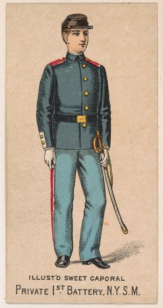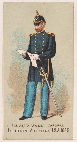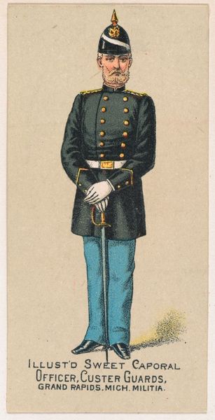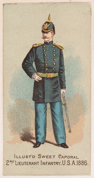 This chromolithograph, made by Kinney Brothers Tobacco Company in 1887, depicts a soldier of the New York National Guard, a symbol of civic duty and martial readiness. Notice the soldier's helmet, topped with an eagle. This recalls the Roman Empire, where the eagle symbolized military strength and imperial power. The Pickelhaube helmet itself, adopted by the Prussian army in the 19th century, evokes a sense of disciplined authority and might. Yet, observe the soldier's posture, a gesture of contained composure. Hands clasped, gaze steady—an emotional restraint, a quiet strength, is communicated. This gesture echoes across centuries. We see it in depictions of Roman emperors, Renaissance portraits of noblemen, each embodying a cultural ideal of self-control. This image also suggests that the meaning of the eagle has evolved, shifting from a symbol of imperial power to one of national identity. The image resonates with the collective memory of military valor, engaging viewers on a subconscious level with deeply ingrained ideals of honor and service.