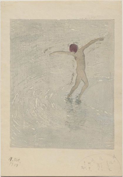 Curator: Allow me to introduce you to Alfred Grévins watercolor, entitled “Male and Female Bathers.” Editor: Immediately, I’m drawn to the watercolor technique. See how the artist lets the pigments flow freely, creating soft transitions between light and shadow. There’s a looseness, an improvisational quality here. Curator: That quality resonates, doesn't it? Look at the stark juxtaposition in the representation of gender and the societal expectations for modesty versus exposure in aquatic spaces during Grévins era. Notice the female figure, constrained by her bathing cap, in contrast to the bare-headed male figure? It speaks volumes. Editor: You're right to point out the contrast. The color palette also supports that division; warm tones for the female and cooler hues for the male, yet both are merged by the consistent aquatic flow around them. The application itself—the way the watercolor defines form while also blurring it—hints at something more than simple observation. Curator: Precisely. This seemingly innocent genre-painting is laden with subversive social commentary. We are invited to ponder themes of class, leisure, and the burgeoning culture of seaside tourism that marked rapid societal transformations. Grévins skillful execution doesn’t mask but enhances the cultural complexities beneath. Editor: Thinking about those compositional elements together makes it more impactful, for sure. Thank you for teasing that out, and helping me go beyond just noting its charm. Curator: And you helped illuminate the visual strategies, underscoring that form, line, color, and composition are far from neutral, that their effects play such an essential part in what the piece as a whole can signify.