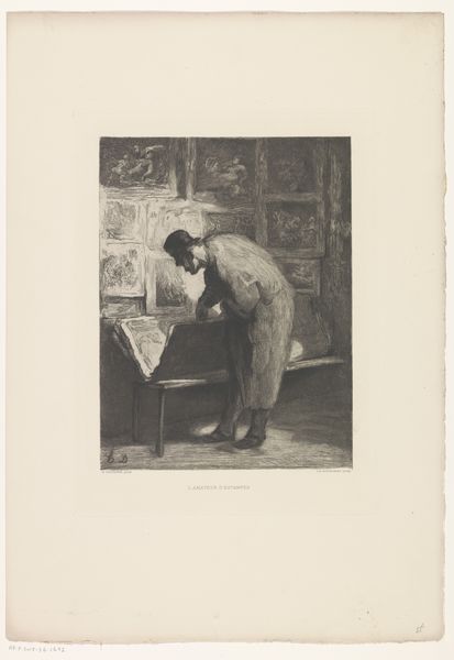 Willem Geets created this drawing, "Man met een baard bekijkt een prent in een studeervertrek", using pen in brown and brush in gray ink. Observe how the composition uses a confined, heavily textured space to create a sense of intimacy. The figure is surrounded by books and papers, suggesting a world of intellectual pursuit and introspection. The sepia tones and detailed linework enhance the density of the scene, evoking a sense of quietude and contemplation. Geets uses the visual elements of the study to create a dialogue between the viewer and the subject. The figure's focus on the print mirrors our own engagement with the artwork, inviting us to consider the act of viewing and interpretation. The books and framed images serve as signs, alluding to broader cultural and historical contexts. The drawing functions as more than just a portrait, it explores themes of knowledge, perception, and the relationship between the observer and the observed. This interplay of observation and representation is at the heart of Geets' artistic project, inviting us to reconsider how we construct meaning through visual encounters.