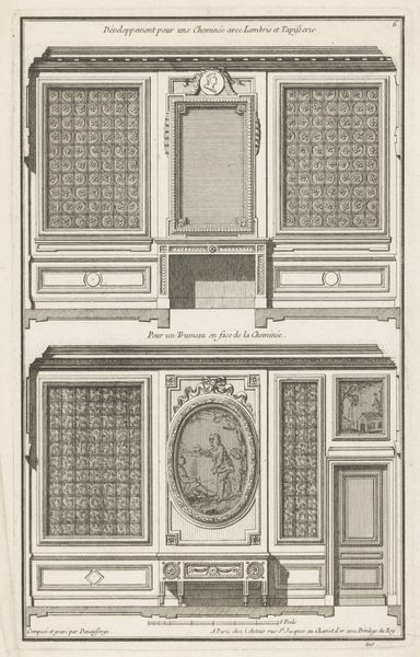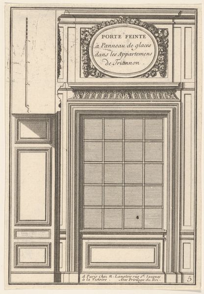 This etching by Jean Le Pautre depicts a door and wall paneling with mirrored glass, intended for the house of ‘Monsieur le Maître’. It was published as part of ‘L’Architecture à la Mode.’ Wood, glass, and the ink on this printed page, all have an important story to tell. Le Pautre was very interested in fashionable architecture, and his drawing emphasizes the geometry and symmetry prized at the time. But it is important to remember that each panel, moulding, and door section would have been produced by a skilled hand. The mirrored glass, too, involved specialized labor to achieve its reflective surface. These refined materials and expert processes speak to the high social status of the intended owner. The mirrored panels especially evoke the rise of consumerism in this period, where one could literally see oneself reflected in new luxury goods. The etching’s importance lies not just in its design, but in reminding us of the skilled labor and social context embedded in every aspect of this fashionable interior.