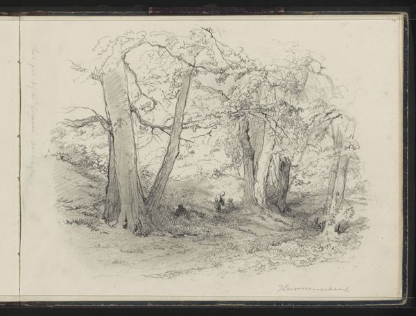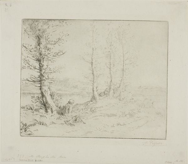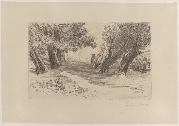 Editor: Here we have "Parti i Sorgenfri," a landscape etching by Axel Schovelin from 1851. It’s a beautifully detailed scene, and the texture he achieves with just lines is remarkable. It almost feels like a photograph, yet distinctly rendered by hand. What do you notice about its composition and technique? Curator: The fineness of line is certainly key here. Observe how the artist manipulates density and direction of these lines. Where are they most concentrated, creating the darkest tones and suggesting depth? Notice how the artist achieves a tonal range through variations in line thickness and spacing. Consider, then, how these formal elements evoke the feeling of a real place, and suggest form. Editor: It's true; the shading around the trees on the right really brings them forward, almost as if they are on a stage. The lighter touch in the background makes the clearing appear more distant. But why use etching in the first place for such a landscape? Curator: The etching technique, with its capacity for intricate detail, perfectly suits Schovelin’s interest in capturing the subtle textures of the natural world. Etching also lends itself to atmospheric effects. Do you see how the fine lines create a sense of shimmering light filtering through the trees? It captures a specific moment in time. Editor: Now that you point it out, I see the atmosphere and light a lot more. It makes me appreciate how important medium can be to the success of a piece. Curator: Precisely. Schovelin has masterfully used the inherent qualities of etching to define space and evoke the mood. Reflecting on Schovelin’s composition has shown me how effectively texture and line create this detailed scene. Editor: This was a great observation exercise. I never noticed how much could be conveyed just by the artist’s choice of line and tone. Thanks!