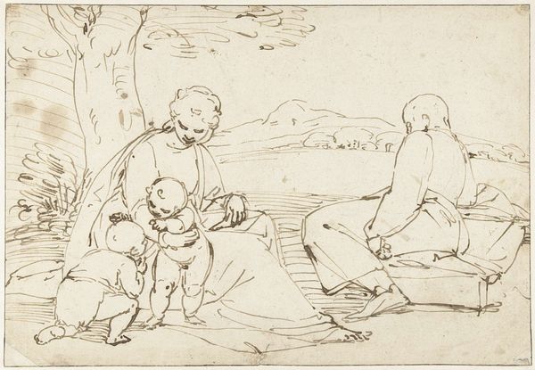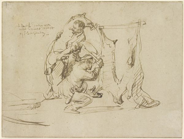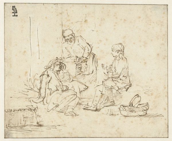 Curator: Looking at this energetic pen and ink drawing called "Tavern Scene," an immediate impression springs to mind: weariness. A tangible feeling of being worn down, but also a kind of revelry mixed in. What about you? Editor: Well, it's chaotic, isn't it? The figures are compressed together, and there's a looseness in the pen strokes that communicates that feeling of disorder really well. It looks like it would have been a bustling environment at the time it was made, though. We can tell from the title that Adriaen van Ostade is interested in scenes of public life and leisure. Curator: Ostade's drawings are full of such immediacy. These quick sketches, done with what looks like both pen, pencil, and black chalk, create something really fascinating that brings Dutch taverns to life. The tavern itself represents a particular space within the collective memory. Editor: Certainly! Taverns served as vital hubs for social and political interaction, and we could perhaps analyze this drawing to glean details of 17th century social structure. Curator: What fascinates me is the way he presents such timeless imagery through gesture. Consider that slumped figure, perched precariously. It echoes so many classical poses, but recast within this Dutch interior, hinting at something like a "ship of fools". There's both humor and implied commentary in this very down-to-earth image. Editor: Absolutely. And it is an important exercise, isn’t it, to trace visual motifs, finding unexpected threads of human experience across cultures and social groups? Curator: It certainly seems so, yes. Even these seemingly commonplace figures seem to carry their own mythic weight. Their emotions ripple outwards and trigger allusions within us. It speaks to how potent visual shorthand can be. Editor: Looking closer makes you really see it! So, as we come to an end, let's not forget Ostade and how much he contributes to the collective narrative of Dutch daily life in his era. Curator: Precisely! This artwork reminds me that imagery is more than mere likeness; it’s a complex visual language we must keep interpreting.