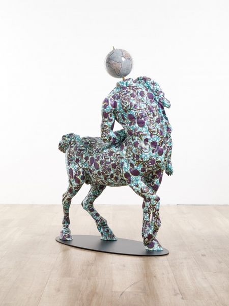 Editor: So, this is Yinka Shonibare's "Farnese Hercules" from 2017, a mixed-media sculpture. It’s… striking! A classical form, but then covered in vibrant, almost aggressively patterned fabric, and a globe where his head should be. I’m immediately thinking about clashing cultures. What's your take? Curator: Oh, "clashing" is one word for it, isn’t it? It’s more like a vibrant collision, I'd say. Shonibare takes this symbol of Western power, the Farnese Hercules, and explodes it with colour and… dare I say it, kitsch. These wax-print fabrics, though often associated with Africa, were actually inspired by Indonesian batiks and mass-produced by the Dutch! A glorious global game of telephone, no? Editor: A game of telephone… I like that! So it's about trade, colonialism… repurposing those narratives? Curator: Precisely! That headless figure with the globe—whose world is it, really? And Hercules himself…strength, power, but he's burdened, isn't he? Weighted down with those vibrant layers, almost suffocated by them. Almost comical in a strange way. Editor: So, he’s challenging the grand narratives, the 'heroic' tales? Turning them on their head, quite literally! I wonder if he is suggesting history is a story someone else tells about you, or you tell about yourself? Curator: Beautifully put. The colours aren't just decoration; they are a deliberate intervention, demanding we re-evaluate the stories we’ve been told. Perhaps asking, ‘Who gets to be Hercules?' A post-colonial critique of power rendered in, of all things, textiles. Brilliant, isn't it? What will stick with you from this encounter, I wonder? Editor: That collision, that “glorious global game of telephone”. The idea that nothing is quite as it seems, especially when it comes to history and power. Curator: Absolutely! A Hercules for our times – flawed, complicated, and utterly fabulous. I think, Shonibare makes one stop and truly see our present as a constant act of rewriting history, right now, even us here today in this room!