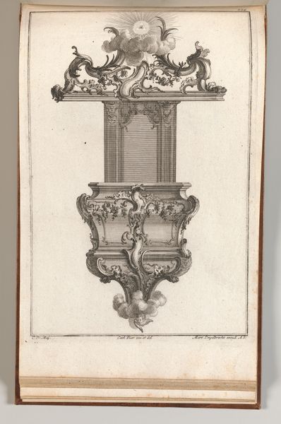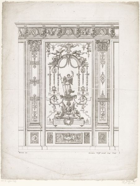 Editor: So, here we have Thomas Chippendale's "Design for a Neo-Gothic Chimneypiece," a drawing from around 1760. It’s incredibly ornate, even whimsical, but I'm finding the depiction of those two human figures oddly unsettling. What do you see in this piece? Curator: Unsettling is a great word for it! I find myself lost in a reverie when I look at this, like glimpsing a dream dreamt by someone obsessed with castles, stage sets, and, yes, the very uncomfortable realities of 18th-century society. Did the figures remind me a little of porcelain dolls, or perhaps pawns on a chessboard? They're a reminder that even the most fantastical designs existed within a complex social fabric. How do you feel that contrasts the delicate ornamentation above? Editor: That tension is really fascinating! The delicate lines and almost fairytale-like architecture contrast starkly with the seemingly burdened figures. It makes me wonder about the people who would have lived with, or even built, such a piece. Were they even meant to "see" those figures? Curator: A potent question! I'd argue Chippendale was making a very deliberate choice – not just a drawing but a statement. Are you sensing any commentary woven into the beauty of it all? The weight of responsibility versus the lightness of design? Editor: Yes, definitely. It makes you consider how design, even something as seemingly frivolous as a chimneypiece, can be a mirror reflecting society's complexities and imbalances. Curator: Precisely! And sometimes, the most uncomfortable mirrors offer the greatest insights. This chimneypiece whispers that very message. It's more than just a pretty sketch; it's a conversation starter. Editor: It really shifts my perspective. Now, seeing it, it has such an intricate and darker quality. Thanks for that! Curator: My pleasure. It's art's power to shift us, isn’t it? To pull back the veil, even just a little.