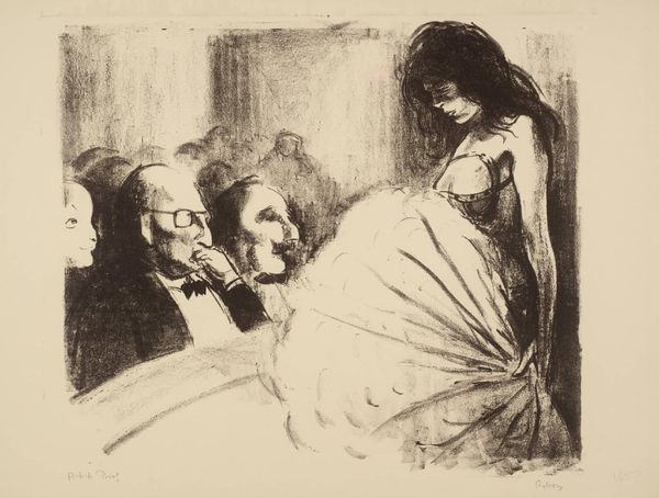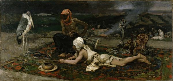 Editor: So, this is Sargent's "The Sulphur Match," painted in 1882 using oil on canvas. It has such a smoky, languid feel to it, almost theatrical. What do you see in this piece? Curator: It feels like a glimpse behind the curtain, doesn't it? Imagine, if you will, a winter evening in some Parisian salon. There's this palpable sense of ennui clinging to the figures. She, the woman blindfolded, almost seems to be drifting off, lost in her own world as he’s casually lighting up a smoke... It's as though the whole scene is a match about to extinguish. Does it strike you that way, too? Editor: It definitely has that fin-de-siècle vibe. The mask lying on the floor – what do you think it symbolizes? A shedding of pretenses, perhaps? Curator: Perhaps a discarded identity or the remnants of the night's amusements, abandoned like a New Year's resolution on January 2nd! Notice how Sargent contrasts the luminous white dress of the woman with the darkness enveloping the man. It feels intentional, hinting at some story bubbling just beneath the surface. A veiled game perhaps? Do you think the title is a giveaway? Editor: It’s such a simple title, yet so suggestive! Maybe life’s fleeting moments? Or fleeting passion. I didn't initially consider it that way! Curator: Sargent was brilliant at capturing those ephemeral moments, freezing them on the canvas with his brushstrokes. He wants us to make up our own minds about what comes before and after this captured vignette. That’s where the fun lies for me. Editor: I see it now! It is like an inside joke or like catching a scene of everyday life and the beauty within it! This has broadened my interpretation considerably. Thanks so much! Curator: It's a shared pleasure. Every artwork is just a beginning of another idea if we let it!