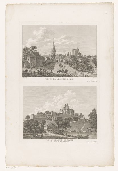 This is a detailed engraving made by Carel Frederik Bendorp. Here, Bendorp uses a dual composition to present two distinct views of Gouda, creating a comparative study within a single frame. In the upper register, the artist employs precise lines to depict the canal, drawing the eye along its length. This is juxtaposed with the lower scene, where the bustling harbor is rendered with a denser network of lines, evoking a sense of activity. The engraving technique itself invites contemplation. The stark contrast between light and shadow, achieved through meticulous cross-hatching, flattens the depth. This flattening challenges traditional perspective, instead emphasizing the surface and the graphic quality of the work. In doing so, the artist compels us to consider the print not just as a representation, but as an object in itself.