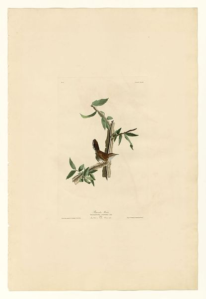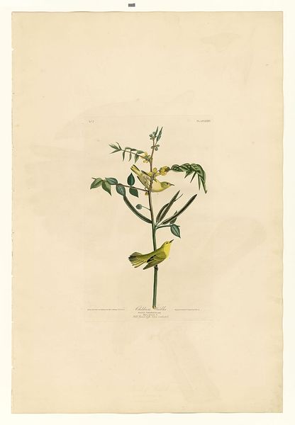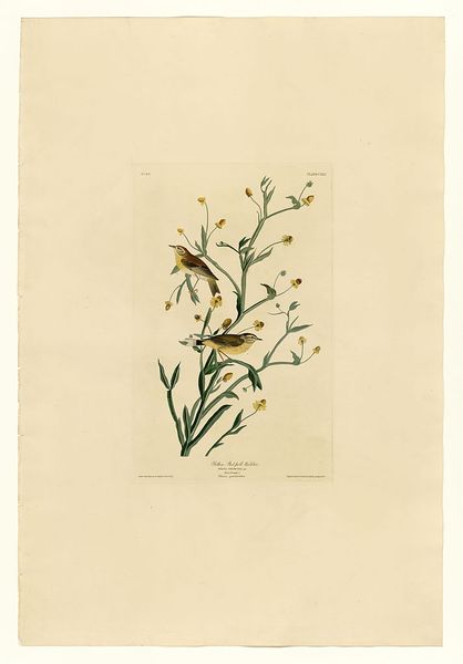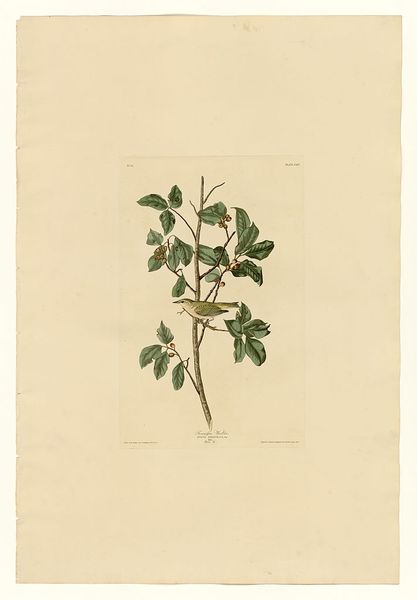 John James Audubon made this print of a Hooded Warbler, using a combination of engraving, etching, and aquatint, all labor-intensive processes. While the subject is natural, the means of production are anything but. These printing methods, requiring skilled artisans, were part of the wider industrial revolution. Consider the social context: Audubon’s images romanticized the American wilderness at a time of intense economic development. The print's appeal lies in its detailed rendering, achieved through careful work with metal plates and acid. These processes have imbued the artwork with a sense of precision, mirroring the scientific aspirations of the time. The texture and weight of the paper also contribute to the work’s presence, inviting close inspection. Ultimately, this print exemplifies the intersection of art, science, and industry. It reminds us that even seemingly natural images are the product of human labor and technological processes.