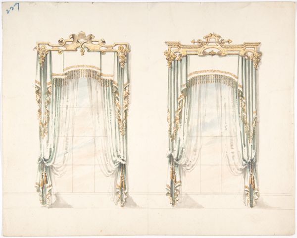 Editor: This is an exquisite watercolor and print design for curtains from sometime between 1815 and 1825. It's called "Design for Pink, Green and White Curtains with Gold and Red Fringes, and Gold Pediments" and its creator is, sadly, anonymous. The curtains look heavy and elaborate, like they’re meant for a palace. What sort of images and ideals do you think these curtains were intended to project? Curator: Notice the color palette: the pinks, greens, whites, golds, and reds. Consider how these shades interact with the visual weight of the design itself. The intention, undoubtedly, was to project luxury and refinement. Think of Neoclassical interiors of the era - these colors and this level of ornate design would be at home with emblems of power and influence such as Greek or Roman motifs, creating an atmosphere that alludes to power and heritage. Editor: So, it's about signaling status? How does that work visually? Curator: The key lies in understanding the symbolic language of the era. Gold, for instance, wasn't just a color; it represented wealth, divine right, and enduring value. The symmetrical arrangement of the design emphasizes order and control - core values within aristocratic circles. The tassels, fringes, and pediments aren’t just embellishments. They amplify the image of prestige and influence. Does this give you any insights into the type of cultural events, or conversations, that might happen in such spaces? Editor: I see! So, it is a carefully constructed symbol of authority...conversations, debates, alliances - powerful people trying to make history? Thinking about the use of those colors, perhaps it’s trying to evoke a sense of serenity with the pastel shades, or the promise of victory with gold, but maybe that's me projecting. Curator: Not at all! It’s fascinating how we read intentions. Do you see, now, how seemingly simple choices carry echoes of the past and visions for the future? Editor: Absolutely, this artwork offers much more than just a glimpse into interior design; it illuminates the values and aspirations of a whole era. Thank you for your insights.