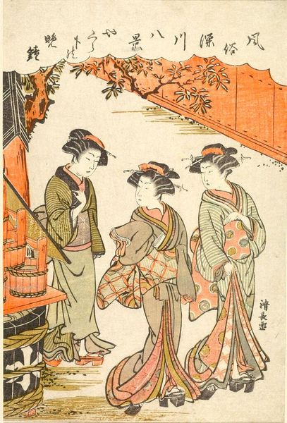 Editor: Here we have Chōbunsai Eishi's woodblock print, "Hanaōgiya of the Ōgiya, with kamuro Yoshino and Tatsuta," from the late Edo period. The figures seem so poised and still. What's your read on this piece? Curator: This print offers a glimpse into the complex social structures of the Edo period pleasure quarters. Consider how the artist presents these women – their elaborate dress, the interior setting – it all reinforces notions of idealized beauty and status, while also obscuring the realities of their lives. What does their arrangement tell us about power dynamics? Editor: So, their positioning isn't just aesthetic, but also a commentary on their roles? Curator: Precisely. The 'kamuro,' the young attendant, looks upward, perhaps signifying her aspirations. The courtesans themselves are carefully arranged, inviting the male gaze, yet also subtly withholding themselves. It's a negotiation, isn't it? Editor: I see, it’s a constructed image, reflecting social expectations but perhaps hinting at individual agency too. Thanks for the insights! Curator: Absolutely. It highlights the intersection of art, commerce, and the female experience in a specific historical context.
