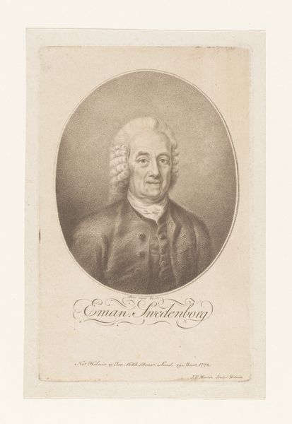 Curator: Looking at this portrait, my initial feeling is one of cool detachment. It's incredibly formal. Editor: Indeed. What we have here is Johann Heinrich Lips's 1777 engraving, "Portret van Heinrich Escher," housed right here at the Rijksmuseum. It’s an exquisite example of neoclassical portraiture. Curator: The oval frame, the elaborate wig, the man's guarded expression... it speaks volumes about status, about the projection of authority in that era. There's a calculated neutrality, wouldn't you agree? Editor: Absolutely. Escher’s gaze is direct, unwavering. Lips has captured that essence perfectly. Considering that this image was widely reproduced, its visual language would have circulated ideas about who held power, and how that power should be perceived. Curator: I'm also struck by how the details work symbolically. The ruffled shirt, for instance, is a visual signifier of his societal rank but also his attention to the finer things. A kind of luxury code. Editor: And beyond just material wealth, the framing, that decorative ribbon... it elevates Escher almost to the status of a relic, set apart from the mundane. Curator: Definitely! His slightly asymmetrical features hint, though, that behind this constructed image of decorum is a living, breathing individual. Editor: It serves to subtly humanize the man. Even in these carefully curated representations, hints of the personal peek through, revealing the tension between social performance and individual identity that still haunts us today. What I think it ultimately is conveying the struggle between internal reality and its representation, and external appearances and the political messages communicated. Curator: Very well put! Editor: It's those nuances, the dance between what is presented and what is suggested, that keeps us returning to portraits like this. Curator: Agreed. The past keeps speaking, if we listen closely.