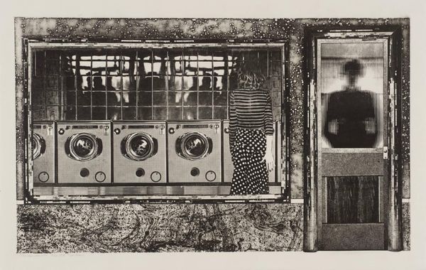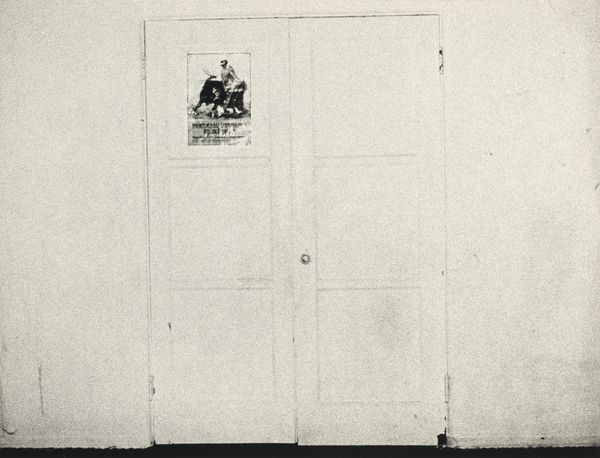 Editor: Here we have Steve Kahn's "The Hollywood Suites (Doors) #1," a gelatin-silver print from 1976. It presents a very stark contrast, almost a diptych, between an artwork and a utilitarian door. What do you make of this juxtaposition? Curator: Immediately, the high contrast is striking. The grainy texture, inherent in gelatin-silver prints, adds to the almost clinical feel. Consider how the frame within a frame – the photograph of an architectural rendering hung on the wall – interacts with the real door beside it. Does the starkness create a kind of minimalist commentary? Editor: I see what you mean. The artwork-within-artwork feels like a grand illusion, and the door seems very real and practical by comparison. But there is another question; what is the effect created by this sharp change in the use of light? Curator: The change and application of light are key. Kahn utilizes a flattening light, almost clinical in nature that strips away nuance and depth. The image in the frame employs sharp contrast of highlights and shadows to construct space. This is critical. Kahn wants the viewer to examine not just *what* they are seeing, but *how* they are seeing. How is our eye being guided? Editor: So it's almost a challenge to our perception, contrasting the real and the represented through differences in light? Curator: Precisely. This creates a dialogue about photographic representation itself and an austere environment. Editor: I had never thought about the technical elements communicating something so directly! Thank you. Curator: Indeed. It reveals the complex interplay between medium, subject, and ultimately, our perception.