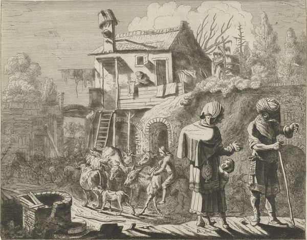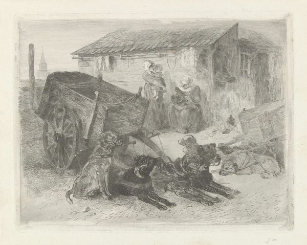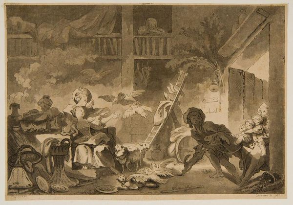 Curator: Oh my, the busyness! "La Cour de Ferme," or "The Farmyard," etched by Jean Claude Richard, Abbé de Saint-Non in 1762, is absolutely teeming with life. Editor: Indeed! Even with this relatively restricted palette of black and white, a dynamism bursts forth, with every texture seemingly defined by subtle shifts in tone and intensity of line work. The balance in the composition, especially regarding the placement of people within it, guides the eye and feels classically structured. Curator: Let’s place this work in its context. The Abbé, while not as widely known today, was a significant figure in the 18th century. A nobleman who also had ties to the church who avidly pursued printmaking in the Rococo style, capturing everyday life but often filtered through a lens of aristocratic sensibility. What we're viewing, then, becomes a complex study in class and artistic expression, wouldn’t you say? Editor: Absolutely. And looking at this specific work more closely, it looks to have been rendered in at least two layers: background architectural detailing that then comes forward via figuration in the people inhabiting it. I wonder what, formally speaking, was the Abbé’s conceptual framework when composing? Curator: The "everyday" he's portraying here excludes a substantial portion of society who are systematically disenfranchised. What can this work tell us about access, or lack thereof, to material and societal structures in the 18th century? Is this representation truthful or biased? Editor: Well, focusing simply on the arrangement of space: high and low, inside and outside are also important components. Even within such a clearly circumscribed area, Saint-Non makes the effort to create and explore separate spheres within. The eye doesn’t linger in one area. Curator: Given our contemporary perspectives and commitments to art reflecting the concerns of every segment of society, how do we position these works which often seem unconcerned with parity? How can institutions navigate these complicated considerations without completely canceling out entire swaths of artwork from our past? Editor: Ultimately it rests on our perspective as observers. Rather than judge by standards so many years distant from then, it’s more insightful to study the artistic toolbox Saint-Non deploys and the technical skills involved. What kind of symbolic value should be applied to any kind of negative space in the visual arrangement? Curator: These dialogues and explorations offer precisely the types of critical assessment that both celebrate the craft of creation, while addressing questions about what it reveals about our values. Editor: And on both macro and micro scales – with sensitivity and critical judgement – may inform viewers productively on the relationship between the composition, materials, and their cultural values and significance.