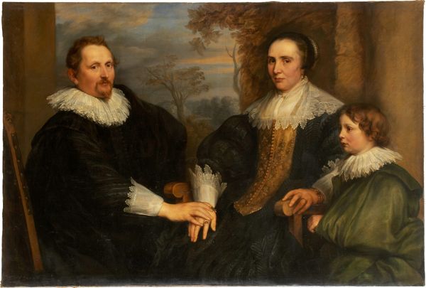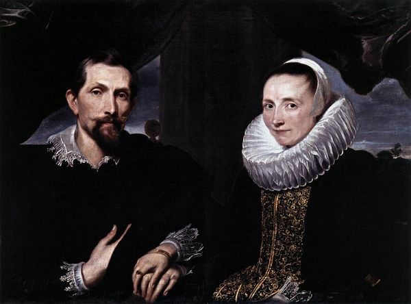Editor: Here we have Anthony van Dyck’s "A Married Couple," from around 1620, rendered in oil paint. The most striking thing to me is the sheer volume of material in their clothing. How do you interpret this work? Curator: It's fascinating to consider the immense labour involved in producing and maintaining those garments. Think about the cultivation of flax for the linen ruffs, the weaving, bleaching, and intricate lacework. The sheer quantity of black fabric suggests access to specific dyestuffs. And the gold thread in the woman’s bodice wasn’t available to everyone. Editor: So the clothing speaks to their social standing? Curator: Absolutely, these garments are loaded with social meaning, a display of wealth through conspicuous consumption, a celebration of global trade networks. Beyond their economic capital, however, look closely. What do you notice about the treatment of their hands? Editor: Well, they are holding hands. They appear less detailed. Curator: Precisely. Van Dyck prioritizes capturing the texture and detail of the fabrics. It begs a question about how this couple valued their representation through possessions compared to their shared emotionality. What story do these carefully crafted surfaces tell us? It invites contemplation. Editor: I see what you mean. Focusing on the materials themselves really opens up a conversation about class, labor, and even values. Thanks, this gives me a lot to think about! Curator: My pleasure. Considering art in this light allows us a deeper appreciation for its complexities and connections to society.