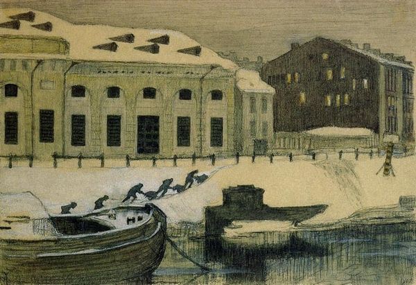 Editor: So, this is Anna Ostroumova-Lebedeva’s "Leningrad. Fontanka and the Summer Garden in frost" from 1929, done in watercolor. The cool tones and the bare trees give me such a somber feeling. How do you interpret this work? Curator: This watercolor captures more than just a winter landscape; it hints at the social and political climate of 1929 Leningrad. Ostroumova-Lebedeva, though trained in a pre-revolutionary world, was working within the Soviet system. Consider how the starkness and lack of human presence might reflect a quiet resistance, a commentary on the era’s austerity and control, if not marginalization. Editor: A commentary through landscape? Curator: Exactly! The choice of such a traditional medium – watercolor – alongside a seemingly straightforward landscape, provides a veil. How can the artist subtly push back against dominant narratives using seemingly innocuous subjects? The muted palette and the emphasis on geometric forms – the buildings, the bridge – hint at the changing urban landscape and the loss of the personal within it. It reflects the transformation and erasure in Stalinist Russia. Does this prompt you to reconsider the "somber feeling" you initially felt? Editor: It does! I hadn’t thought about the absence of people as a deliberate statement. It felt like a simple, wintry scene. Now I wonder if it's also a reflection of societal constraints of expression? Curator: Precisely! Ostroumova-Lebedeva provides the public a way to explore one's own personal identity through nature and silence, thus asking what we see of ourselves in such a potentially political landscape. What has stood out most for you while discussing the context with this art piece? Editor: The idea that even a landscape can be a form of protest, especially when viewed through the lens of history. Curator: Absolutely, and hopefully, that provides an approach to how we think about other works of art as well.