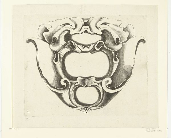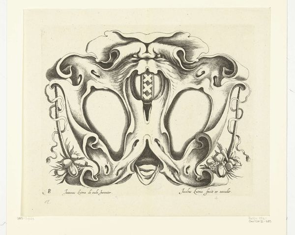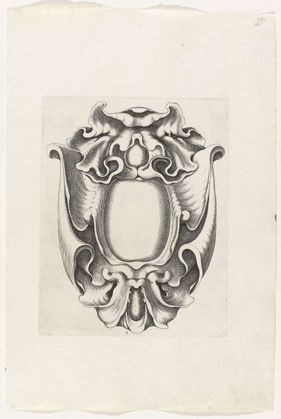 Jacob Lutma created this etching titled "Cartouche with a Mask at the Bottom and Top," in the mid-17th century in Amsterdam. Lutma was working during the Dutch Golden Age, a period of immense wealth for the Dutch Republic, but also one marked by rigid social hierarchies. This ornamental cartouche, with its grotesque masks, would have been used to frame text or images, signifying the importance of what it contained. Consider the duality in its design; the elaborate swirls and flourishes that speak to wealth and luxury are juxtaposed with the rigid, symmetrical structure, reflective of the controlling social norms of the time. Lutma, as an artist, was navigating this world, creating beauty within the confines of societal expectations. How does this tension between freedom of expression and social constraint resonate with you?