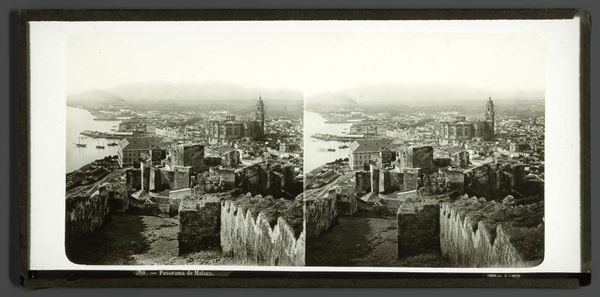 Editor: This gelatin silver print, titled "Gezicht op de Borobudur" by Adeline Andrea du Celliee Muller, was likely taken between 1930 and 1940. There's such a subtle gradation of tone, capturing a landscape dominated by those temple structures. What compositional elements stand out to you? Curator: Immediately, I observe the strategic arrangement of forms. The photograph divides into distinct horizontal zones: the intricate stonework of the foreground, the dense mid-ground foliage, and the ethereal mountains of the background, all united by the monochromatic tonality. This layering creates a sense of depth and visual rhythm, compelling the eye to traverse the picture plane. Do you notice how the artist's point of view lends a geometric abstraction to a historical setting? Editor: I hadn't considered that level of formal interplay! I was mainly focused on the visual textures and how the lighting is so diffused, avoiding strong shadows. Curator: Precisely! The soft light across these forms reveals texture and structure with notable economy. In this light, there is an equal distribution of compositional attention which enables an interchange of landscape with architectural planes. How does the work resolve, given this exchange? Editor: It’s like Muller is less interested in presenting us with representational facts than with showing a structured play of forms using a restricted palette. Curator: You’re touching on an important realization. The work resides at the intersection of documentation and abstract expression. The choice of black and white photography encourages one to consider the tonal range as a self-sufficient subject. Editor: I’m definitely walking away with a better appreciation for how much can be communicated through pure form. Curator: And I’m reminded of the power of photographic landscapes to reveal structural subtleties within expansive spaces.