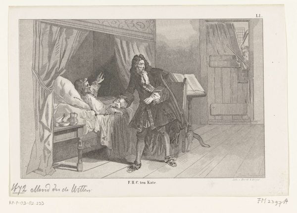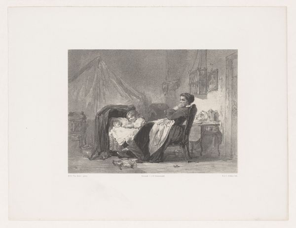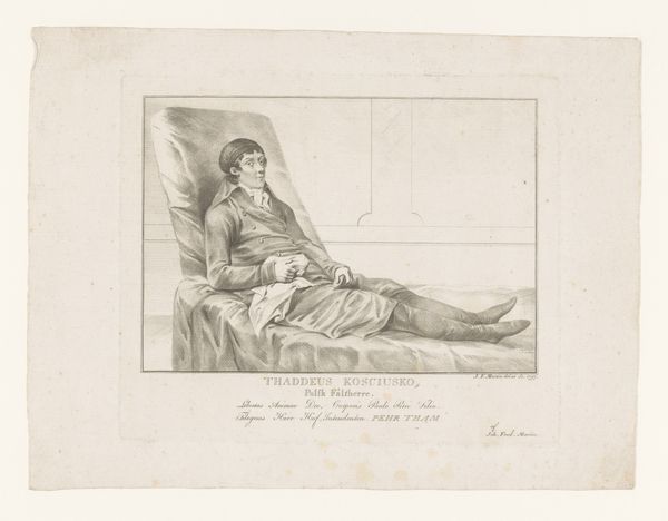 Editor: Here we have William Sharp's portrait of Thaddeus Kosciuszko, a print of some kind. He's reclining, looking quite contemplative... What do you make of it? Curator: It's as if Sharp has captured a moment of quiet reflection amidst a life of revolutionary action. See how Kosciuszko seems to be gazing towards a brighter future just beyond the window, or is it a lament for what was lost? Editor: That's a lovely thought, it almost feels like he's contemplating the weight of leadership. Curator: Indeed. Perhaps Sharp is inviting us to consider the human cost of ideals. It also makes me wonder what stories those letters hold on the table nearby. Editor: I see what you mean. Thanks for sharing your perspective, I'm definitely seeing this portrait in a new light! Curator: The pleasure was all mine. Art is a portal, isn't it? A way of connecting to the past, and to ourselves.