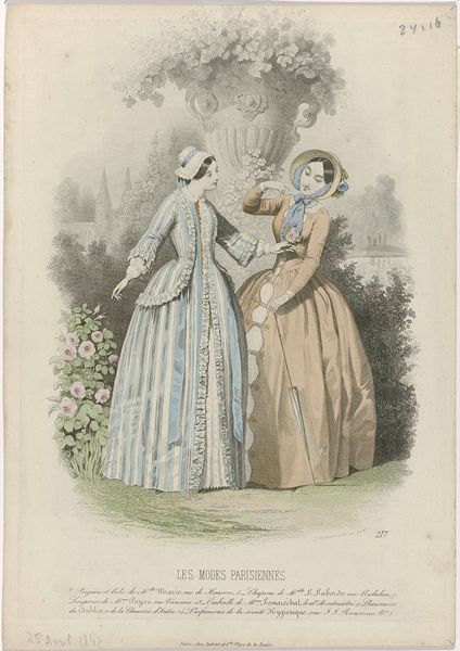 Editor: This delightful print, "Petit Courrier des Dames," is from 1841. It showcases two elegantly dressed women. I'm immediately struck by the focus on detail and how clearly it represents fashion of the time. What is your take on this piece? Curator: Well, viewing it as a historian, this print serves as a fascinating record of societal values. Fashion plates like this one weren't just about clothing; they represented status, aspirations, and the ideal of femininity that was being actively constructed and circulated within Parisian society. How do you see the poses of the women impacting its social message? Editor: They seem somewhat posed and stiff, maybe conveying a sense of propriety? Curator: Exactly. And it wasn't just about propriety, but projecting an image of leisure and wealth. Notice the layers of fabric, the intricate details – these clothes would have been incredibly expensive. The magazine itself functioned within a burgeoning consumer culture, encouraging women to aspire to these styles. It also indirectly spoke about what work was appropriate or not. What’s suggested by these being the ‘Modes de Paris’ Editor: So, by showcasing these fashions, the print is simultaneously reflecting and shaping cultural norms surrounding women and their place in society? Curator: Precisely. The "Petit Courrier des Dames" helped dictate the visual language of the era and who could participate in it. It is far more than ‘just’ a fashion plate. Editor: That's given me a totally different perspective! I now appreciate the historical weight carried within such seemingly delicate lines. Thanks for highlighting its cultural significance!