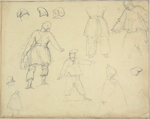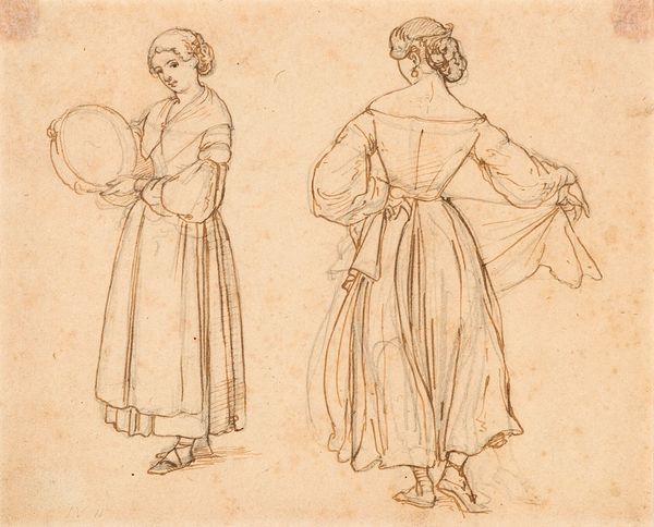Editor: This is William Valentine Schevill's "Sketch of a Woman with a Tray; verso: Sketch of a Man with a Hat in his Right Hand." It looks like it's a preparatory sketch. What's your take on its role and context? Curator: Sketches like these are fascinating because they offer a direct link to the artist's process. Consider the social function of portraiture at the time. Were these studies for a commissioned piece? Or personal explorations of class and identity? Editor: I hadn't thought about it in terms of social class. So, the clothing and the objects are significant? Curator: Precisely! The woman's bonnet, the man's hat and coat, even the tray – these details speak volumes about their social standing and the expectations placed upon them. How might these sketches reflect, or even challenge, those expectations? Editor: That adds a whole new layer of meaning. Thanks! Curator: My pleasure! It's all about seeing art as part of a larger conversation.