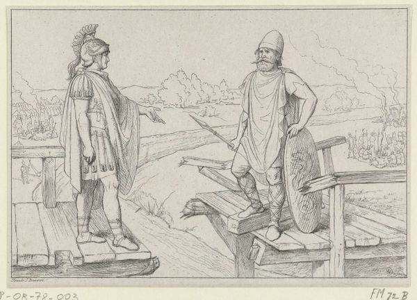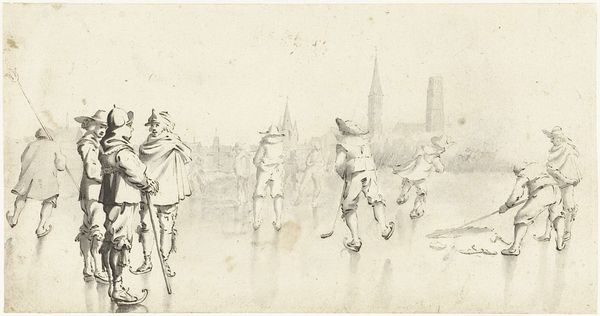 Curator: Before us, we have a pen and pencil drawing by Gerard ter Borch, dating from around 1633-34. It's titled "Two Officers Gazing at the Ruins of Brederode Castle." Editor: It’s stark. Bleak, even. The landscape has a fragile quality about it, like a half-remembered dream. Curator: Notice how ter Borch employs simple lines, focusing on spatial relationships. The officers in the foreground, though rendered economically, establish a clear sense of depth. The composition pulls your eye toward the skeletal remains of the castle. Editor: The ruins immediately struck me. This isn't just a pretty scene; it's loaded with symbolism. Brederode Castle, a monument now decayed, evokes loss and perhaps even futility. Curator: Precisely! It prompts us to consider Dutch history, to the rise and fall of power structures, as material forms vanish, while certain power structures continue with their authority seemingly in-corporeal. What resonates, however, is his controlled manipulation of the picture plane through subtle tonalities, something underemphasized about symbolism's force. Editor: And those officers—their erect posture juxtaposed with the decaying castle suggests an interest with themes of transience versus permanence, their youthful vigor presented against a background that signals history and defeat. The clothing and feathers feel slightly antiquated. Curator: One can understand that symbolism, for sure. Yet I read a formalist perspective also into the lines he places so that they are weighted to certain effects more than just realistic imitation of clothing...it could represent also a conceptualization, which is neither there nor is there only as symbol. Editor: A conceptualization of historical consciousness perhaps? Borch sets these men against this powerful ruin—suggesting their consciousness carries this symbolism beyond pure observation. Curator: An intriguing reading! A fine way of reflecting how our image processing helps generate a conversation, whether the discussion leads into symbolism or materiality. Editor: Indeed. I leave this image contemplating how objects in decline carry symbolic import in ways often unanticipated.